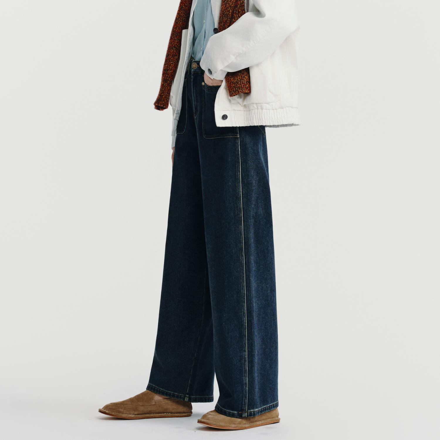 王家有鱼加绒小个子复古蓝直筒阔腿裤女2025年秋冬新款百搭牛仔裤