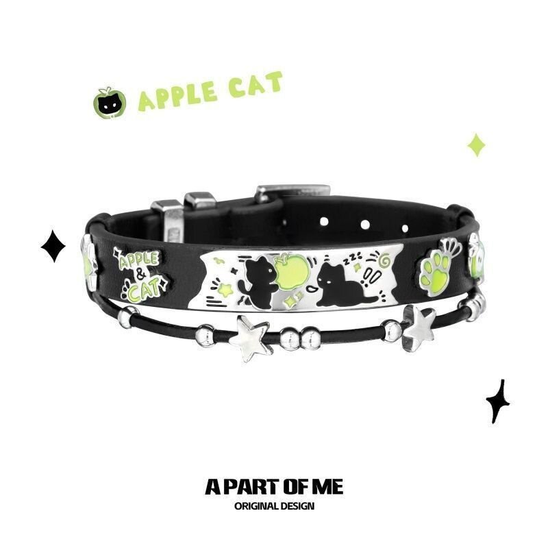 敲可爱!黑猫青苹果手链新款原创小众设计甜酷皮革手环手镯猫咪