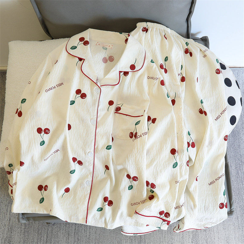 红豆纯棉纱布睡衣女长袖长裤春秋款套装甜美樱桃可外穿开衫家居服