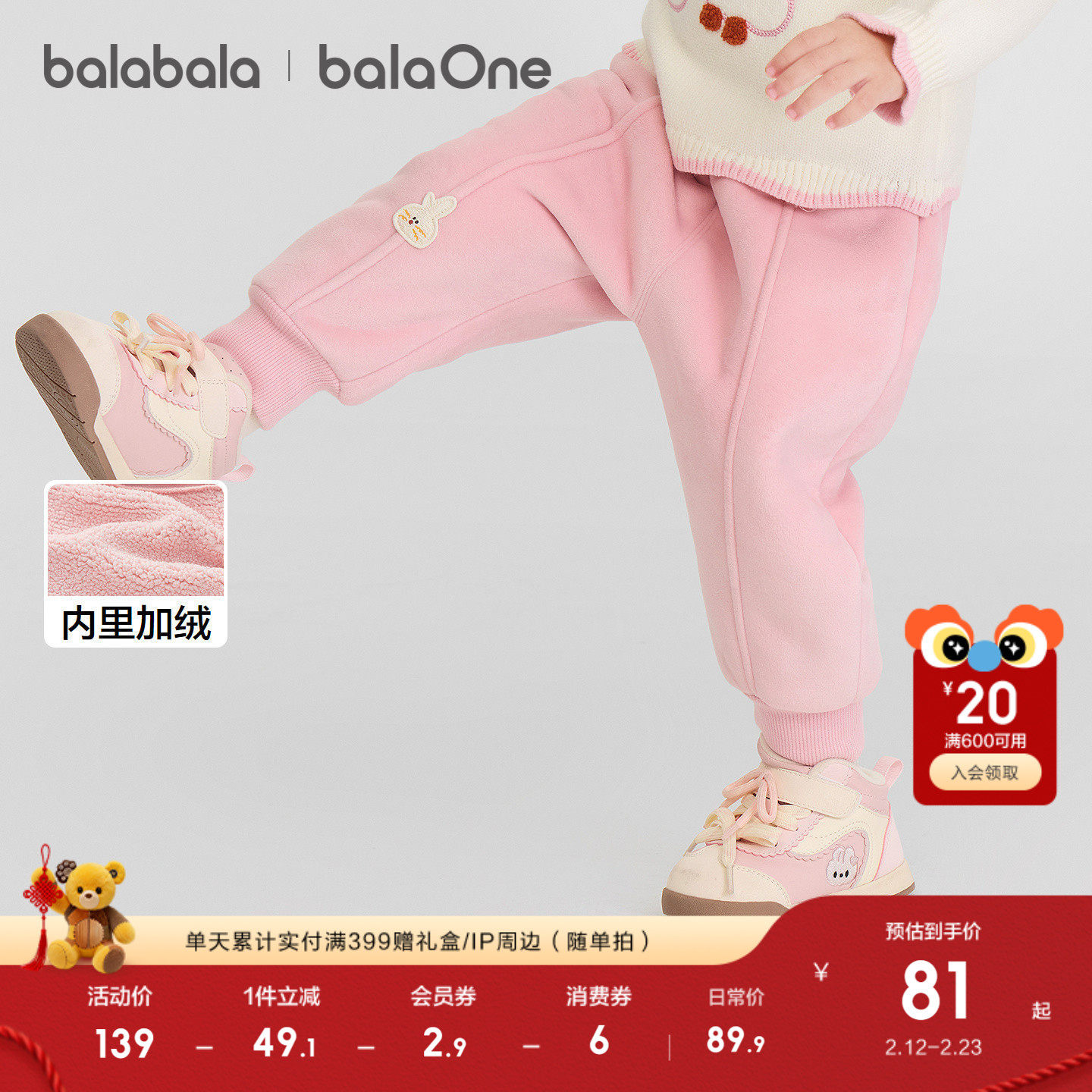 巴拉巴拉童装宝宝长裤儿童加绒保暖裤子2025新款冬装男童女造型萌
