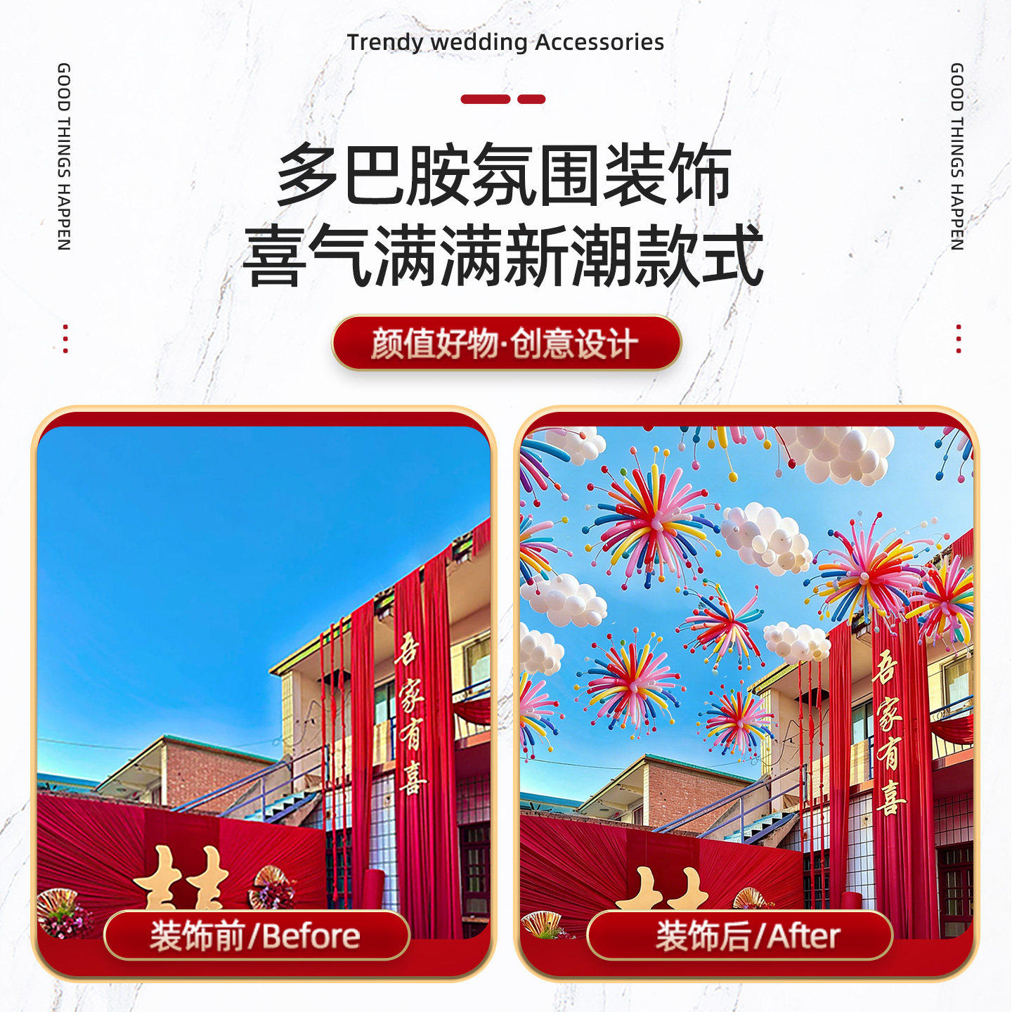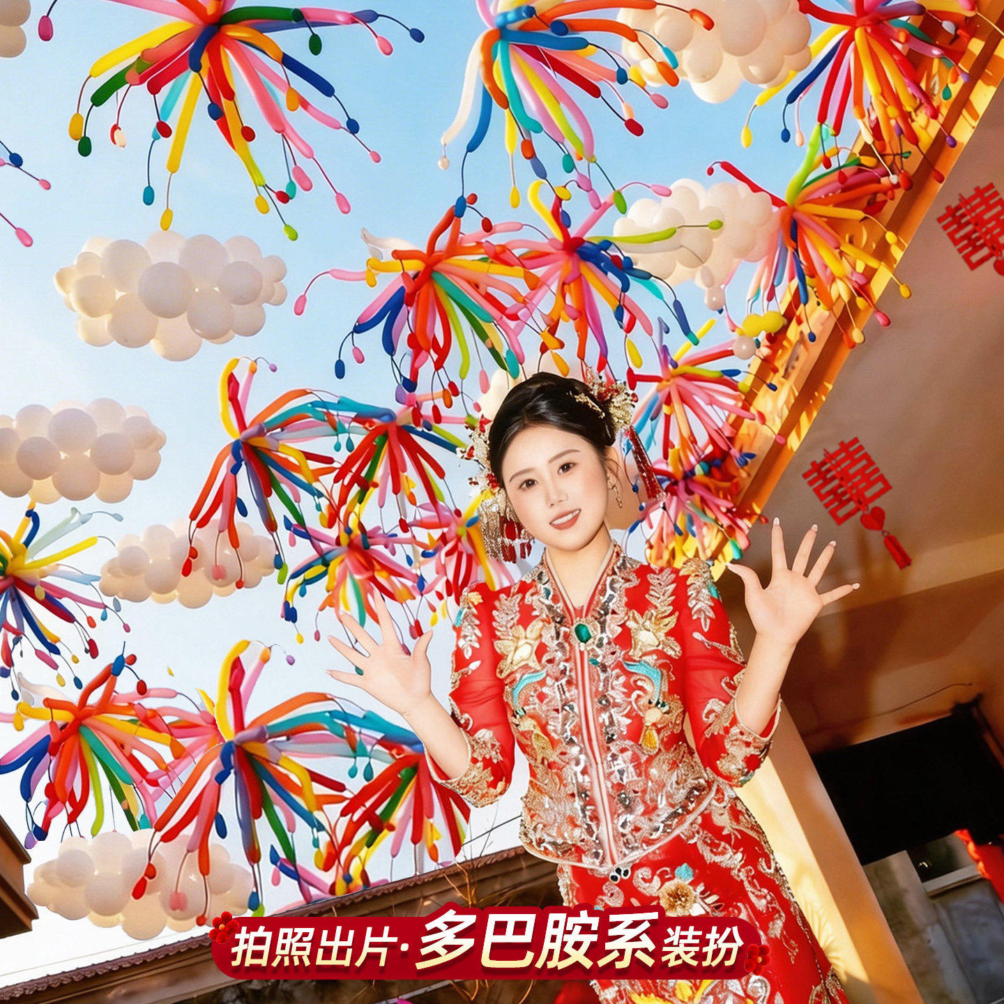 结婚农村院子烟花长条气球别墅自建房布置婚房装饰喜字婚礼氛围