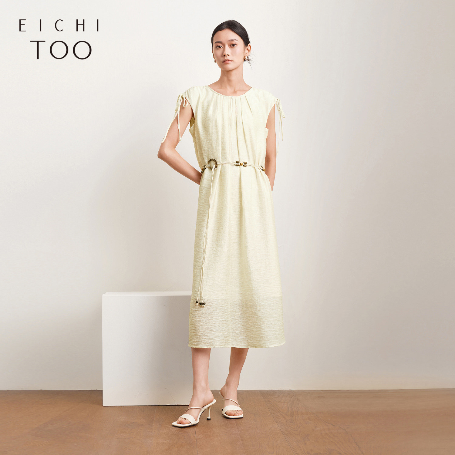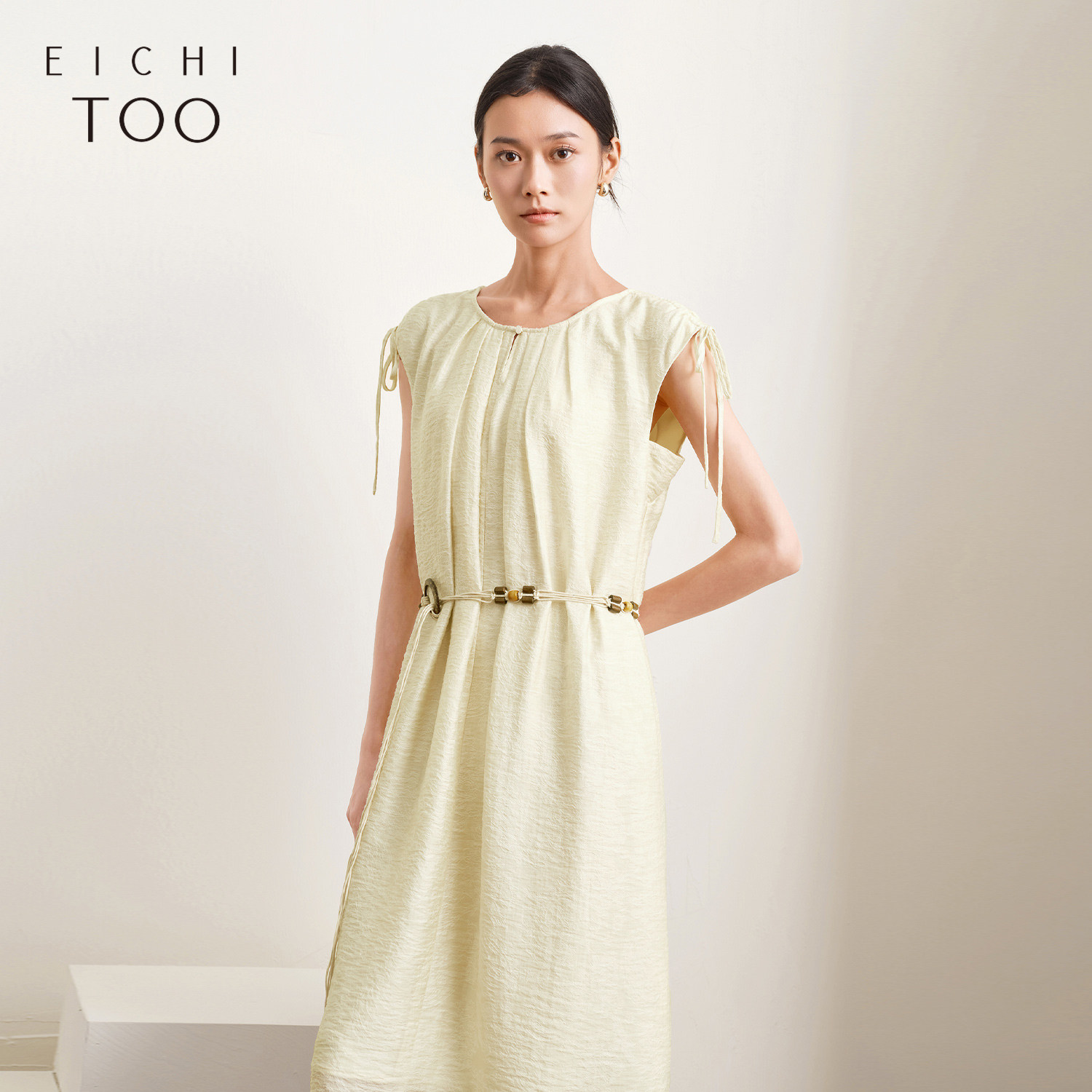 爱居兔莱赛尔肌理感提花连衣裙夏季新款女假风系带无袖长裙