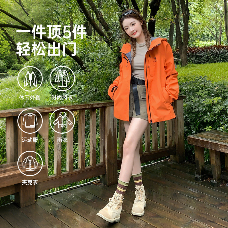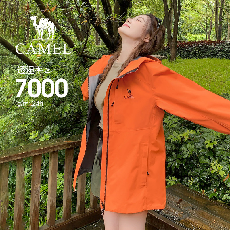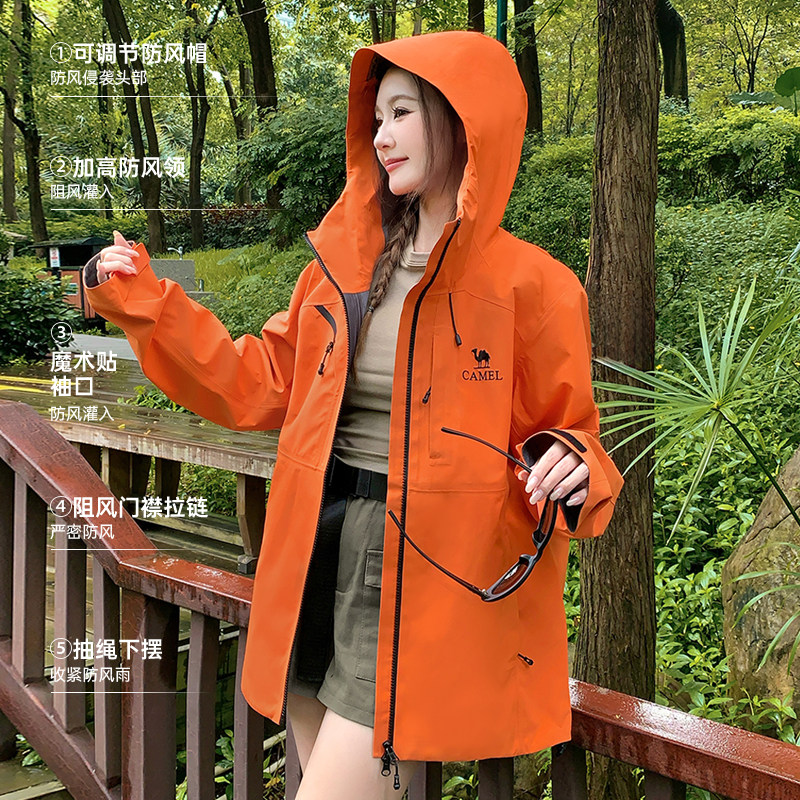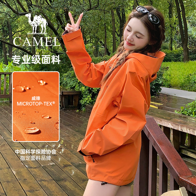 骆驼女装冲锋衣户外春秋款橙色三防登山服2026硬壳徒步连帽茄