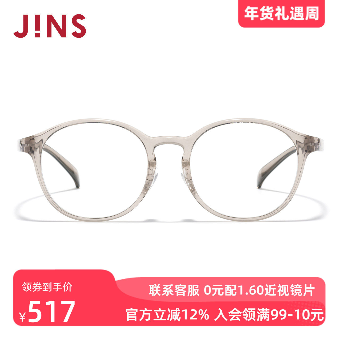 JINS睛姿HOME近视眼镜大圆框轻量休闲可加配防蓝光镜片UGF25A216
