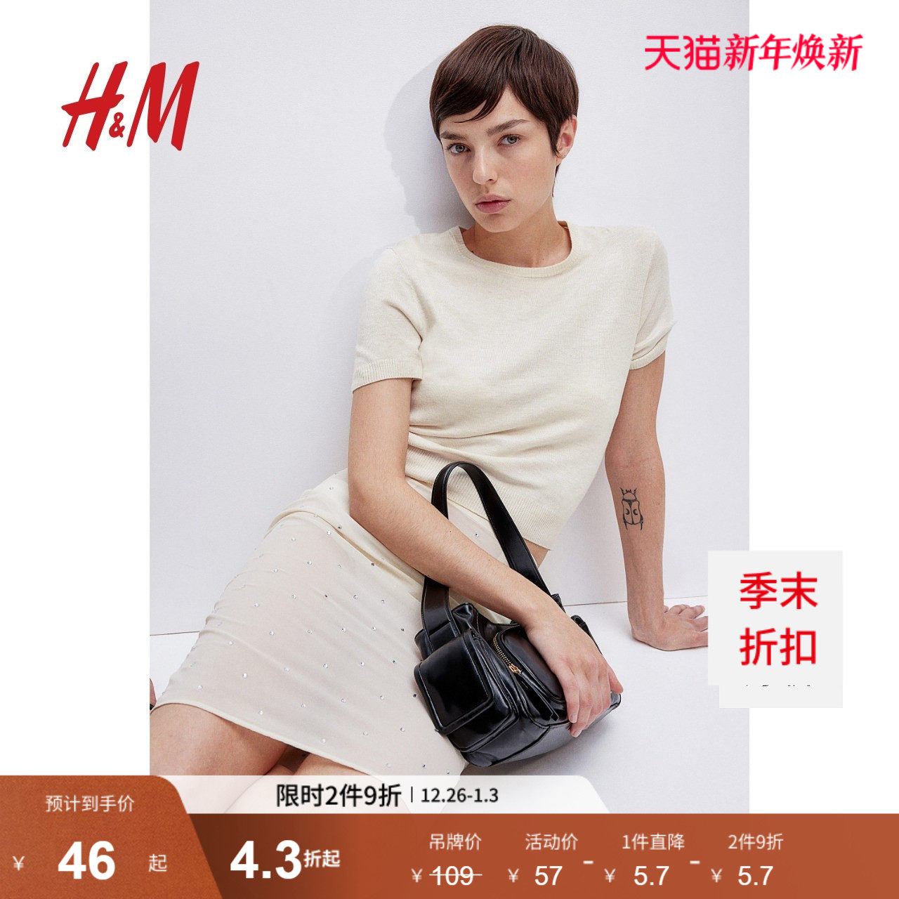 HM女装毛针织衫冬季短袖短款修身罗纹领口针织T恤1232470