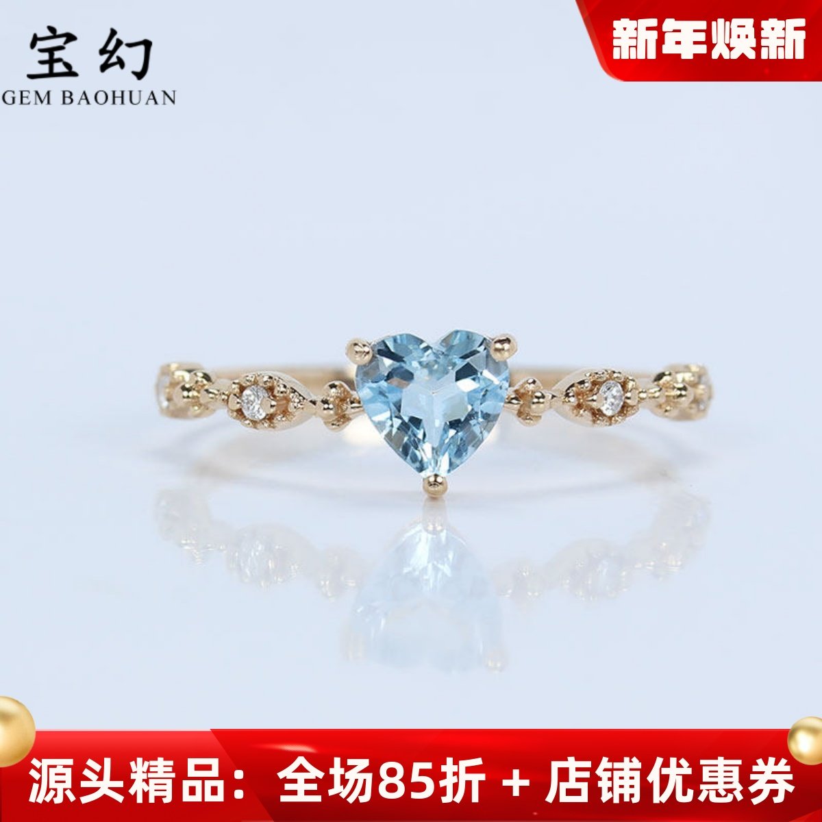 翡宝丽18K玫瑰金天然海蓝宝石心形复古戒指 天空蓝钻石尾戒指环女