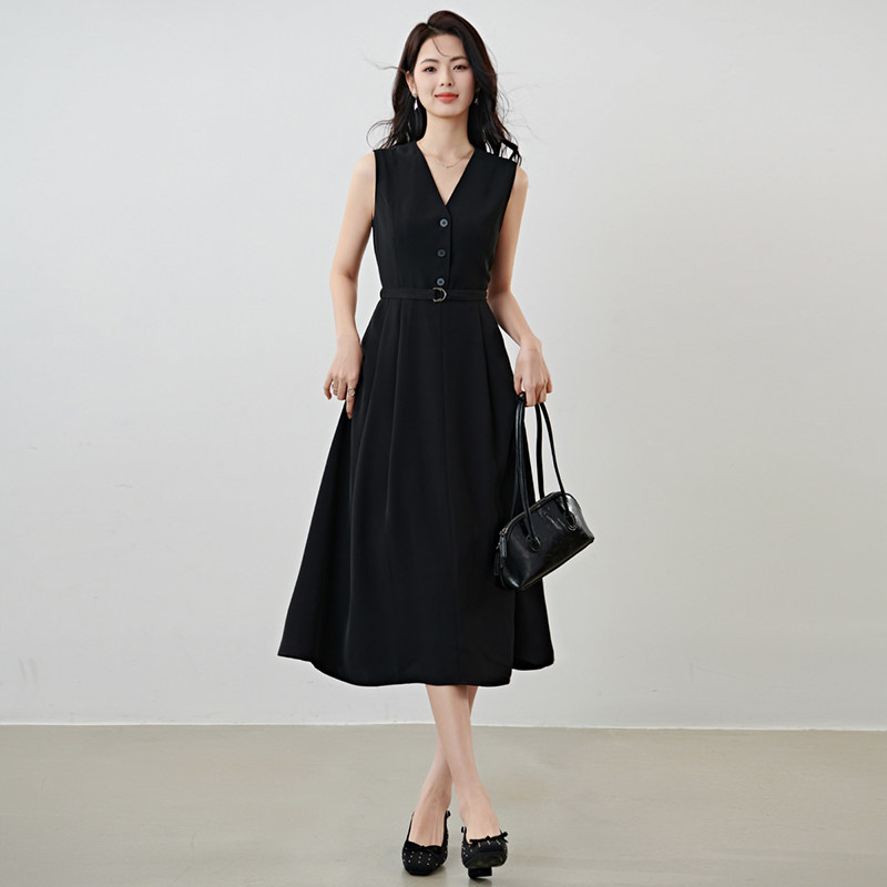 晚白2026年春新款气质V领系带裙子赫本风小黑裙高智感无袖连衣裙