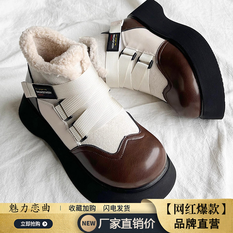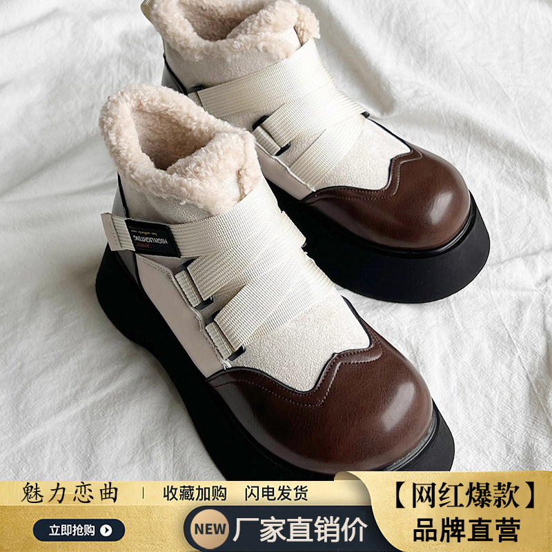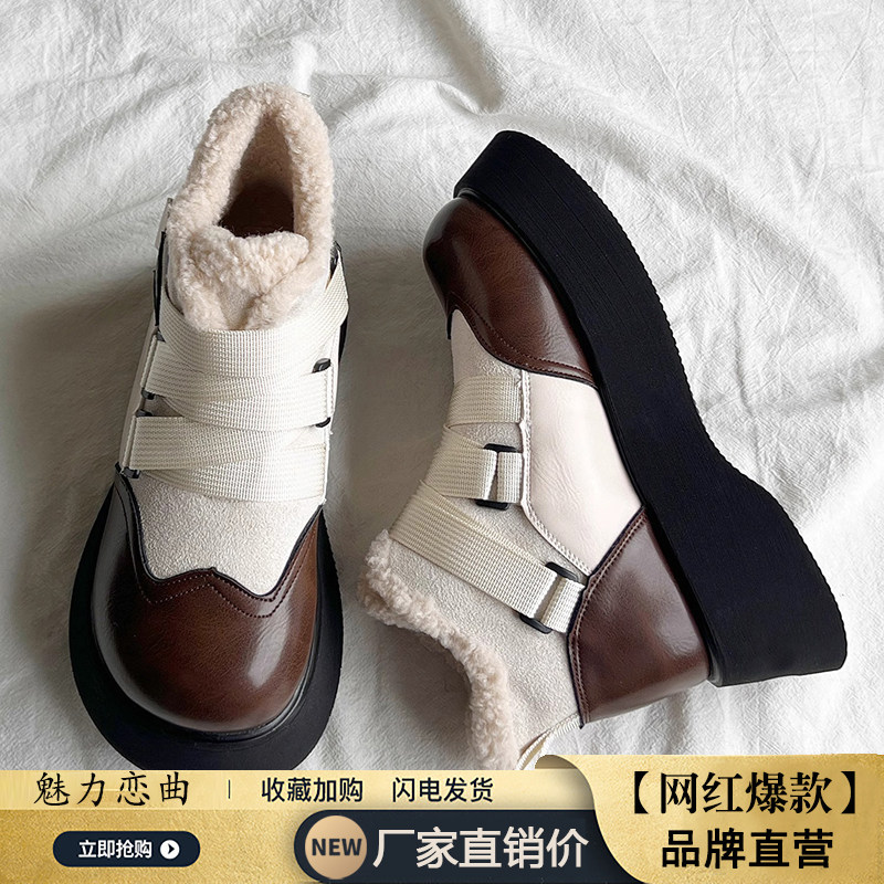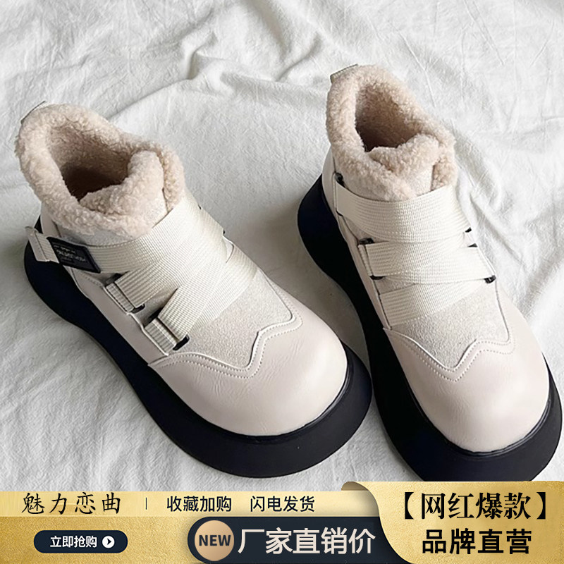 miu家厚底雪地靴女冬季真皮短靴羊毛侧拉链增高厚底加绒毛毛棉鞋