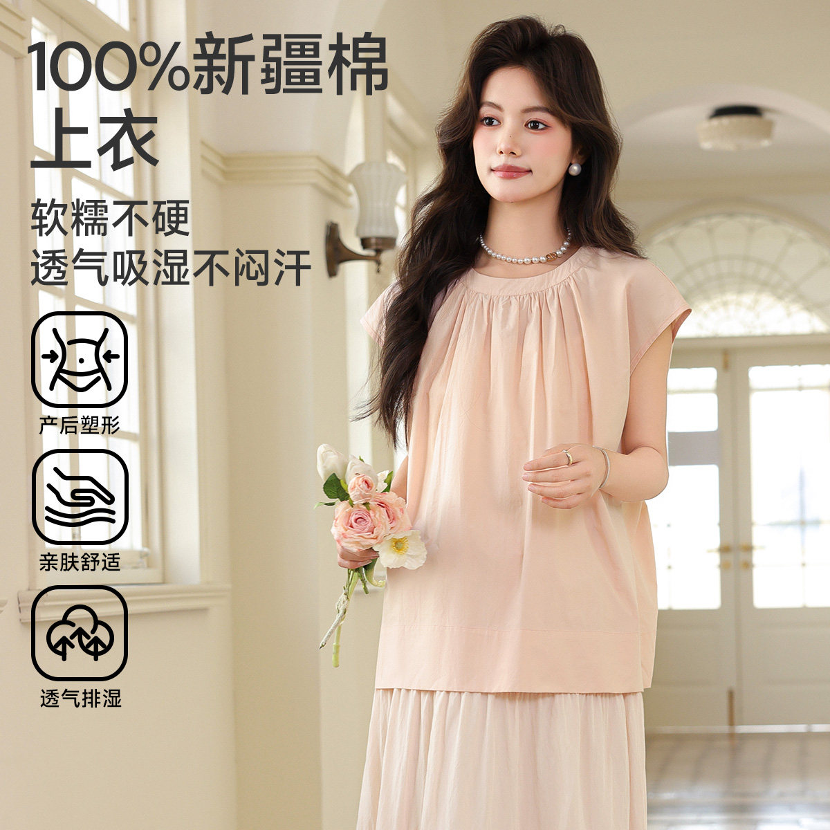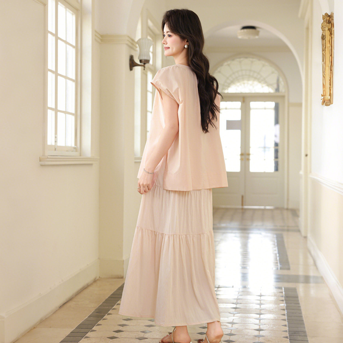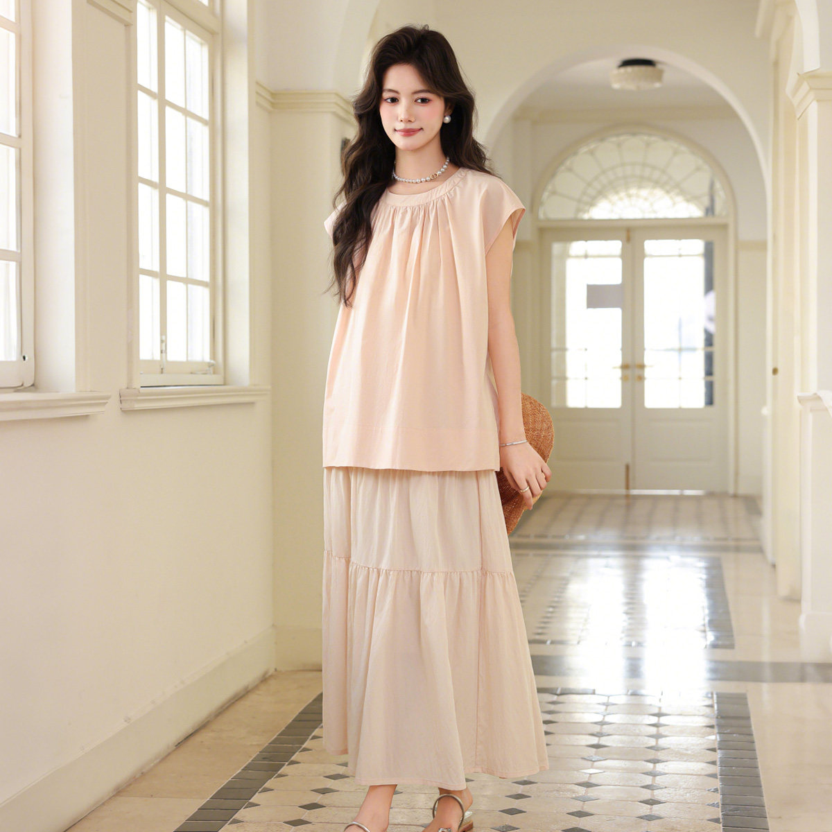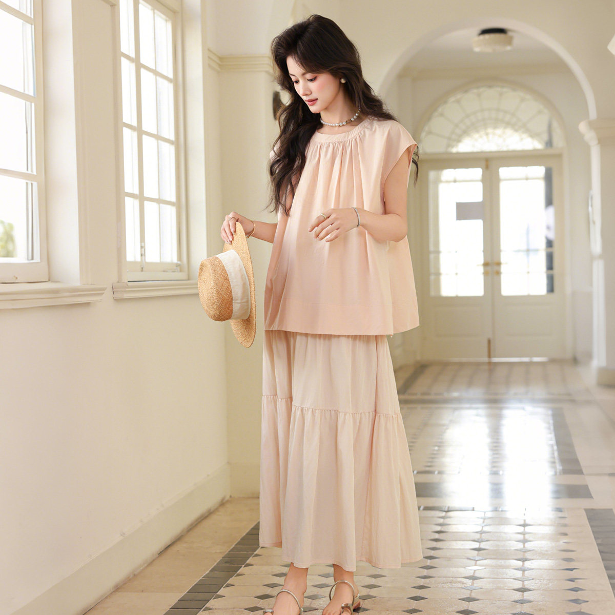 婧麒孕妇套装2026新款春夏甜美风无袖上衣半身裙两件套女粉色套装