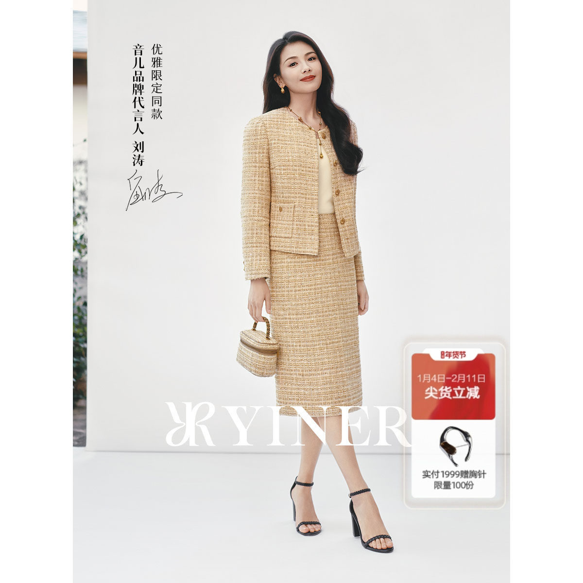 【刘涛同款】YINER音儿2025春季新款优雅小香风亮丝粗花呢半身裙