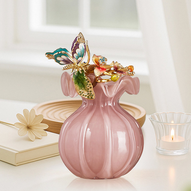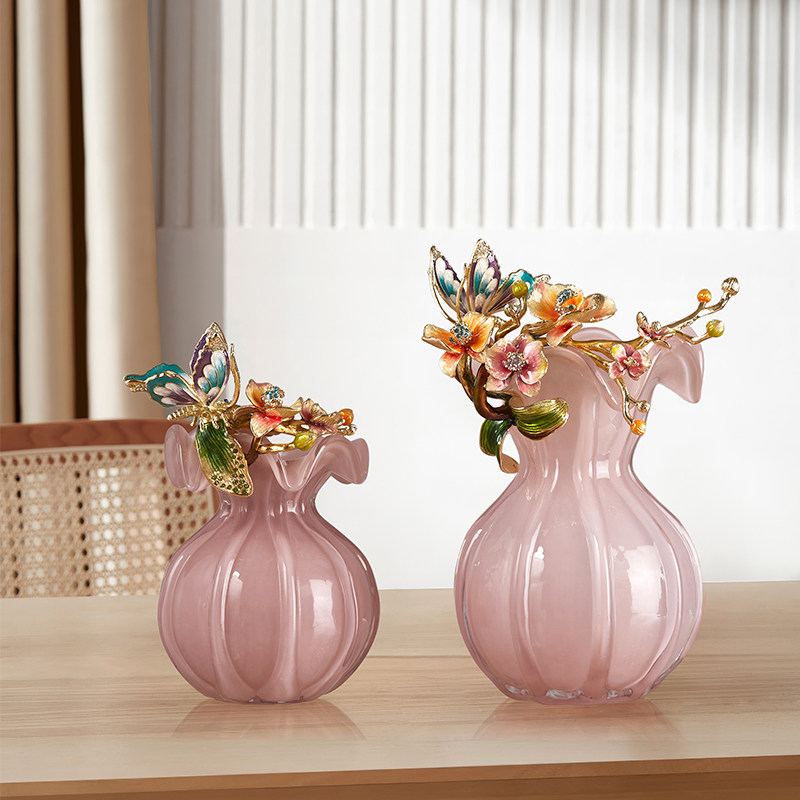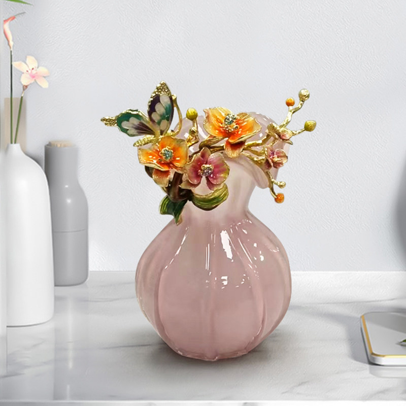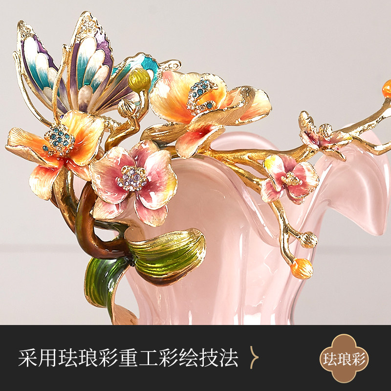 珐琅彩工艺花枝蝴蝶 莫兰迪粉色瓶身