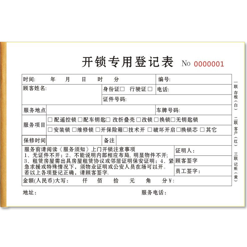 开锁业务登记表二三联锁匠专用上门服务记录表换锁收费收据本定制