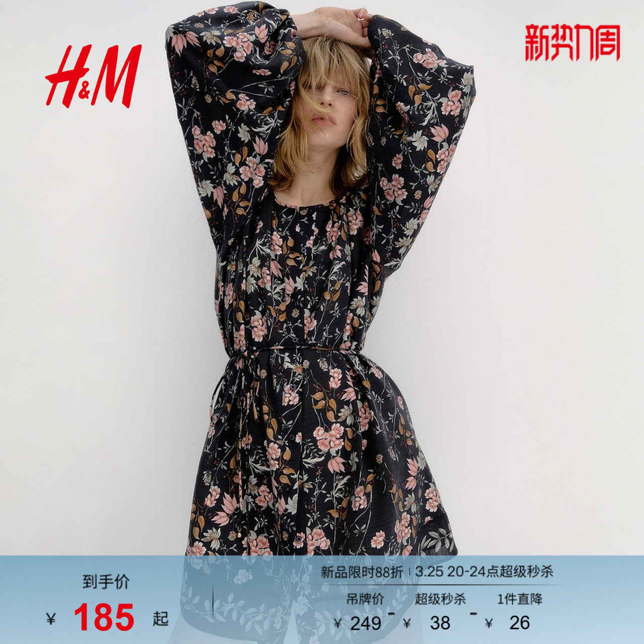 HM女装连衣裙春季腰部系带大廓形喇叭形连衣裙1297142
