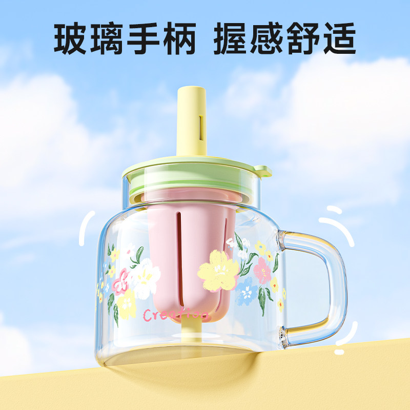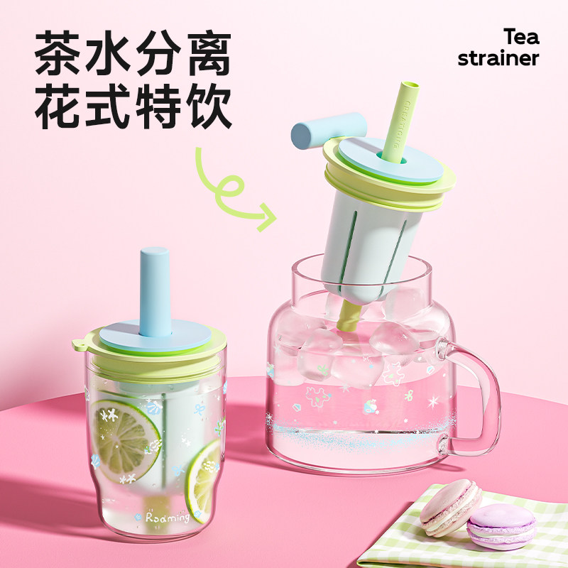 万兀玻璃水杯高硼硅女大容量吸管耐高温茶水分离高颜值带盖咖啡杯
