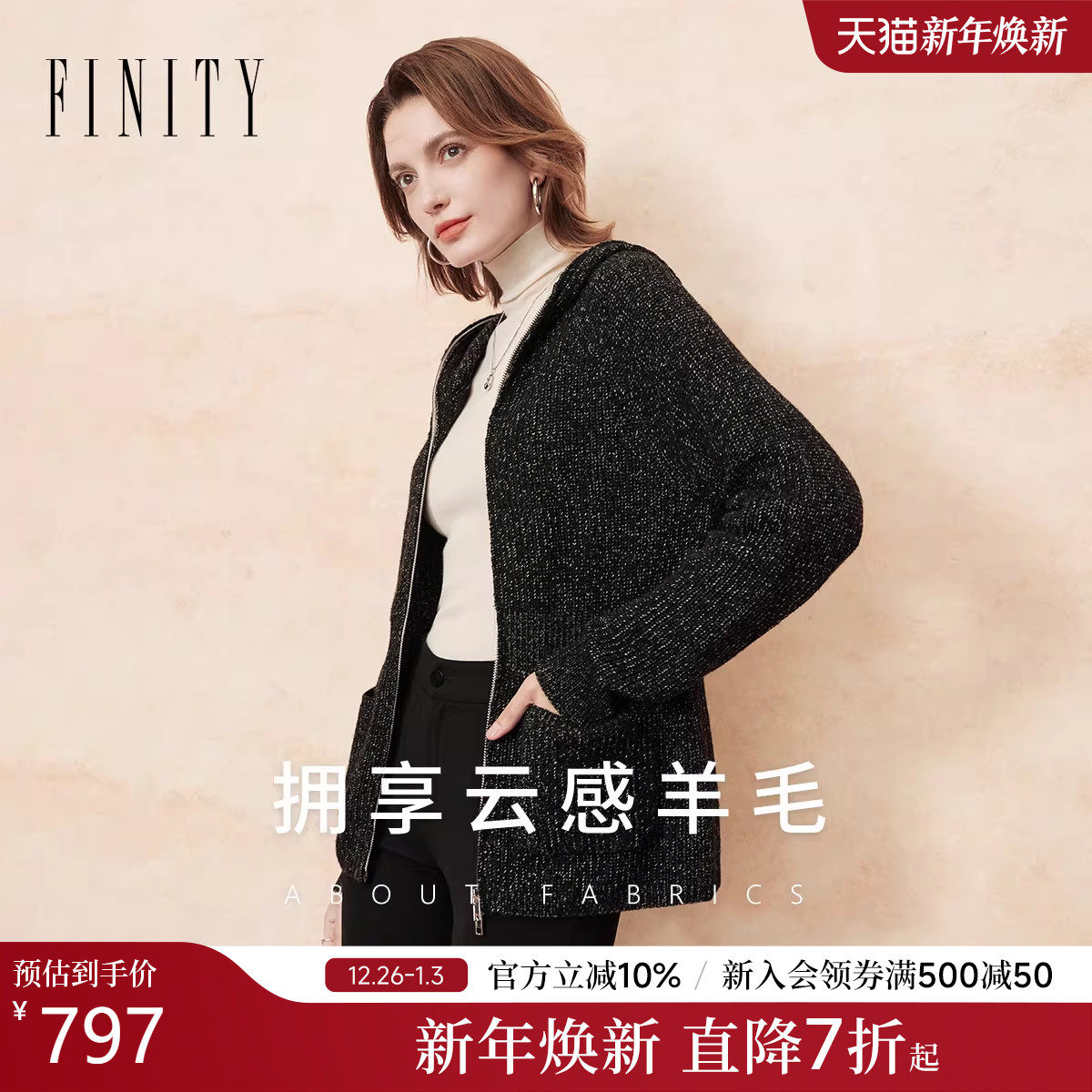FINITY菲妮迪羊绒衫2025年冬季新款简约气质连帽休闲针织外套女士