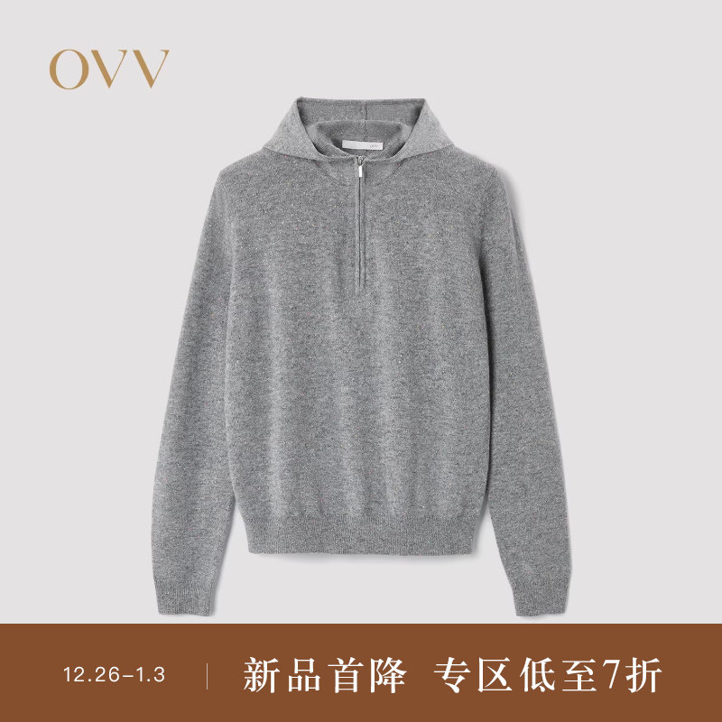 OVV2025秋冬新款女装简洁连帽半开襟彩点设计长袖羊绒衫