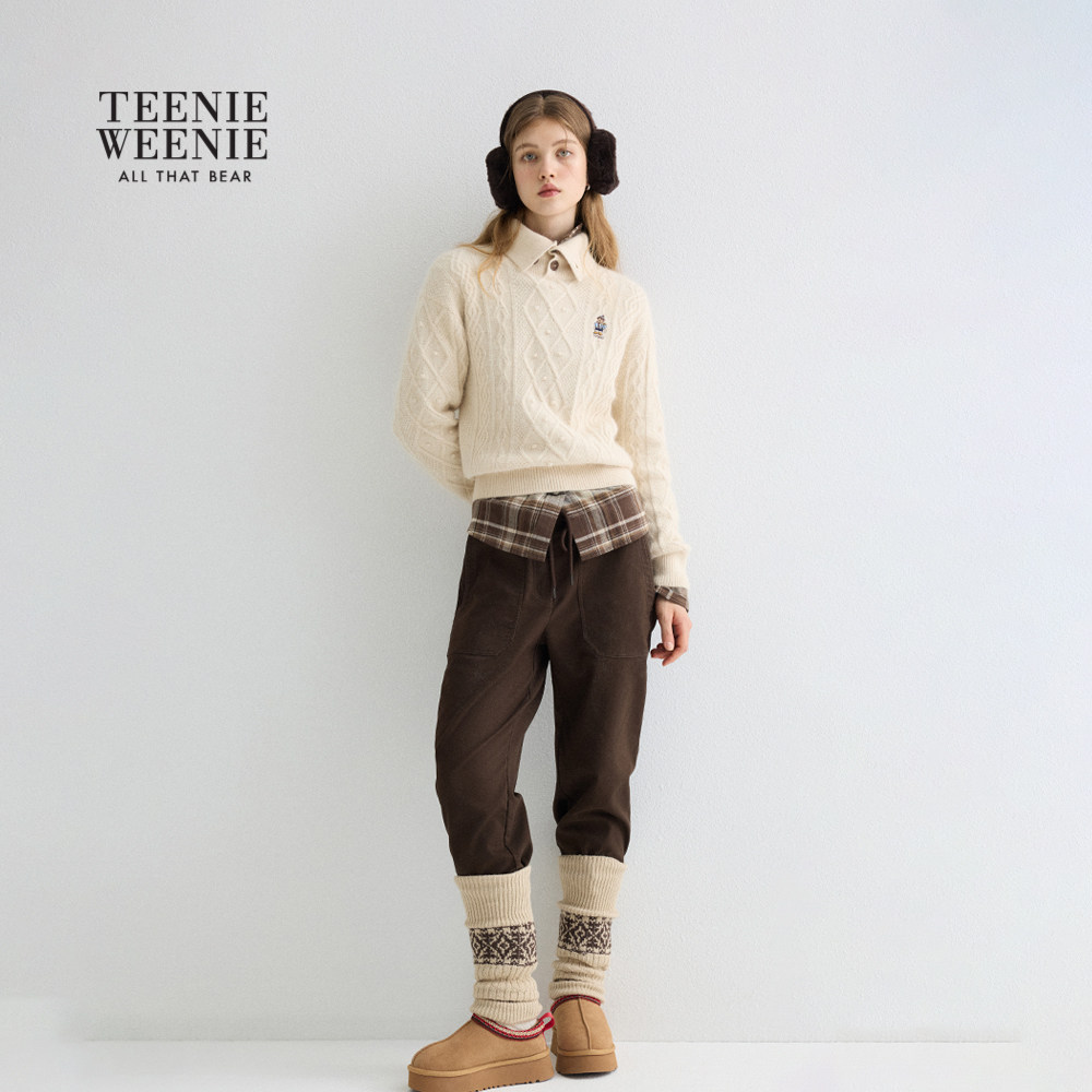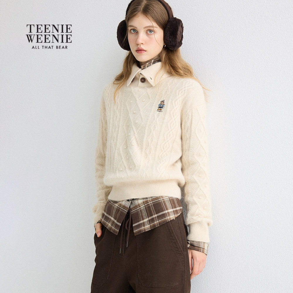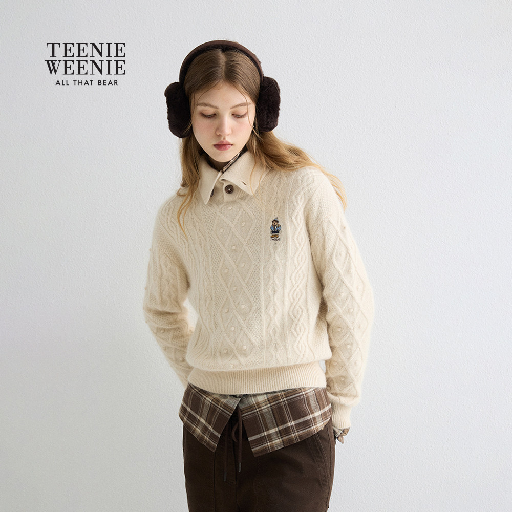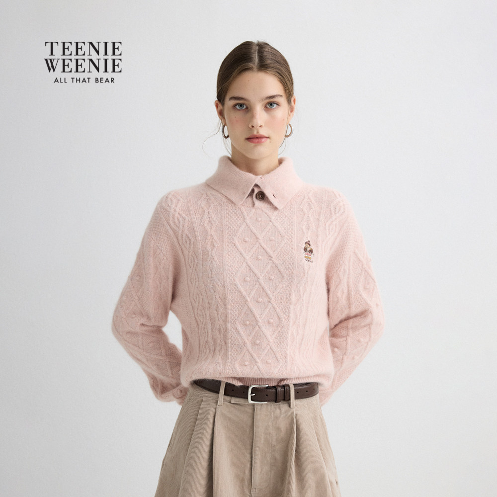 【含羊毛】TeenieWeenie小熊女复古绞花针织衫秋冬季粉色翻领毛衣
