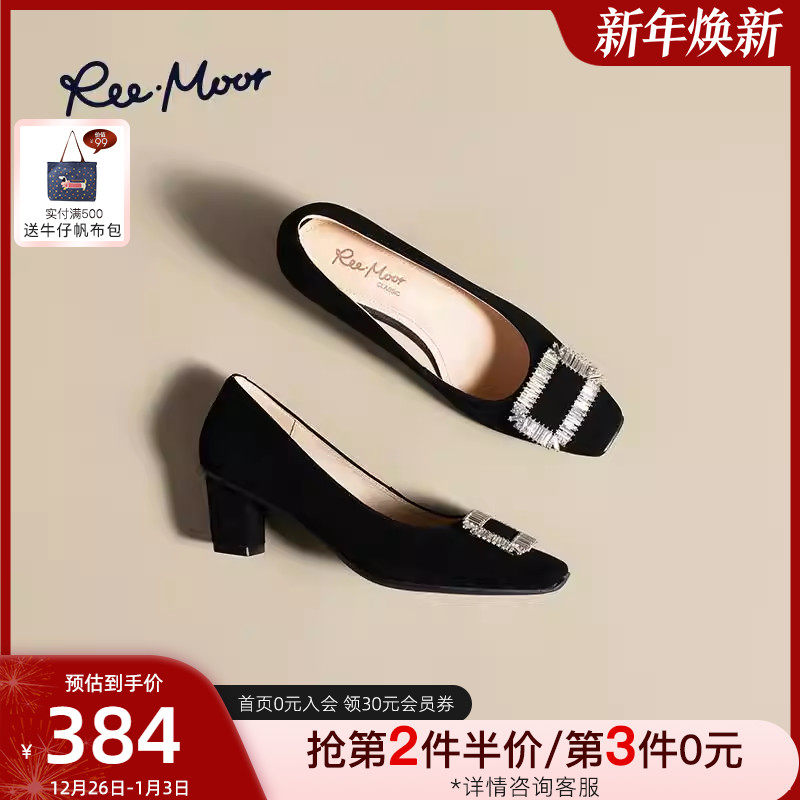 REEMOOR睿慕2025年新款法式粗跟单鞋女浅口黑色通勤气质时尚舒适