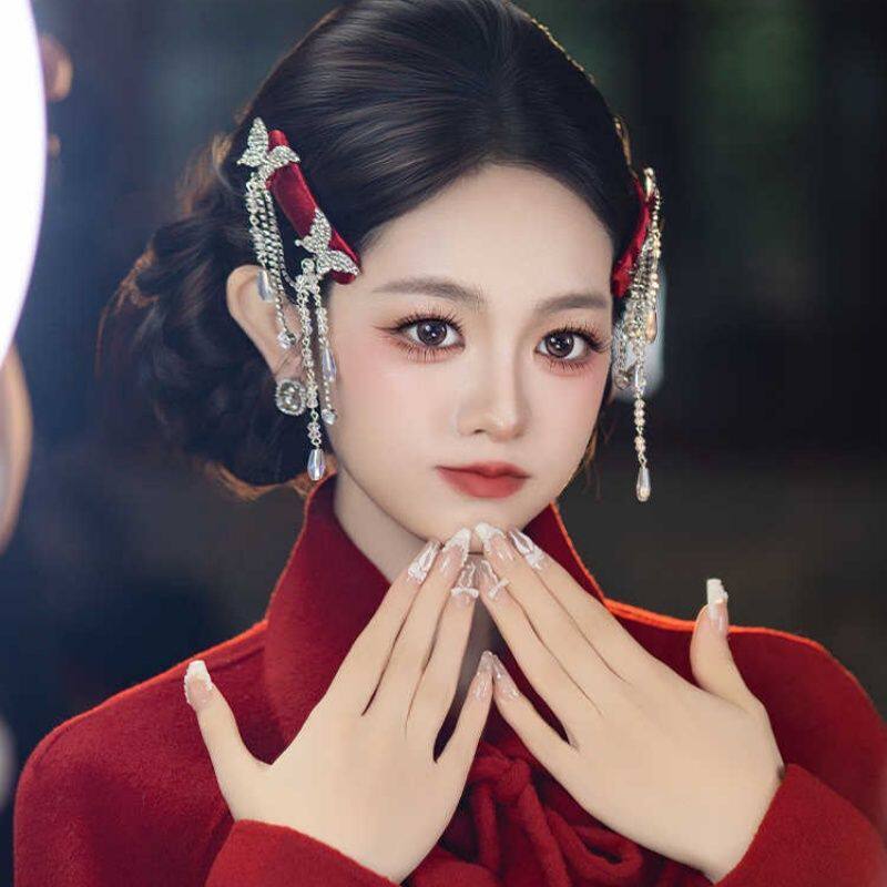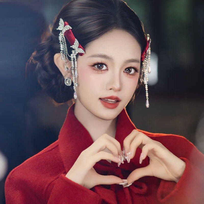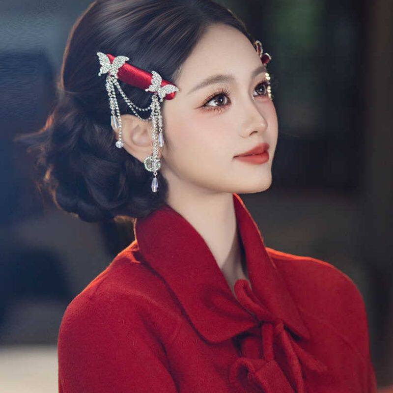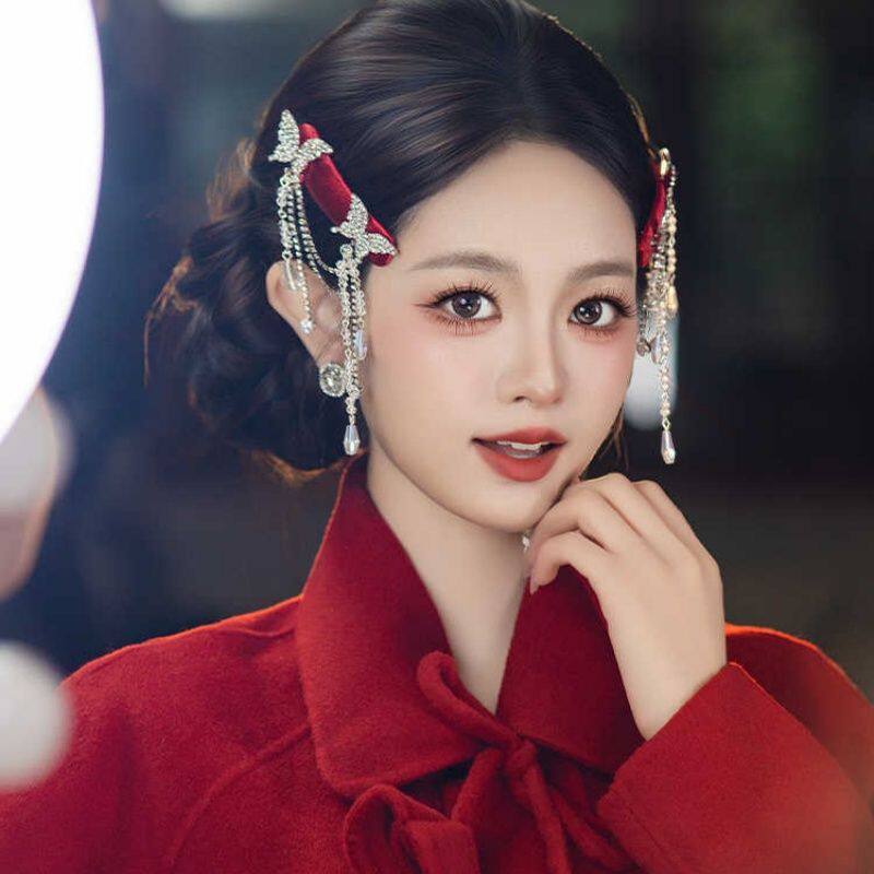 新中式国风新娘复古酒红色蝴蝶流苏发夹高级感造型旗袍汉服头饰品