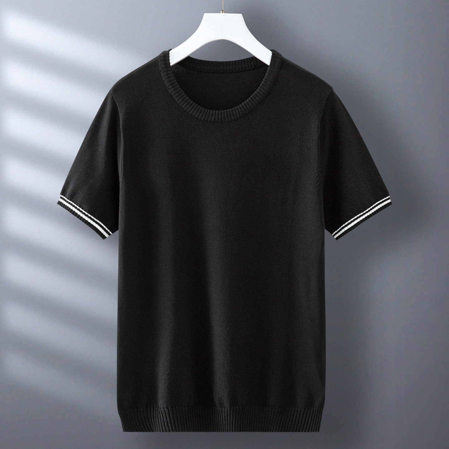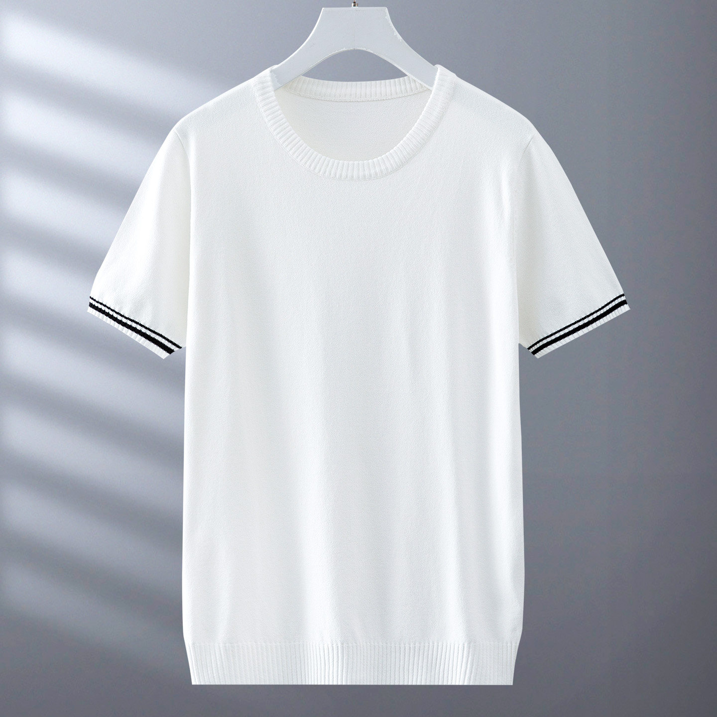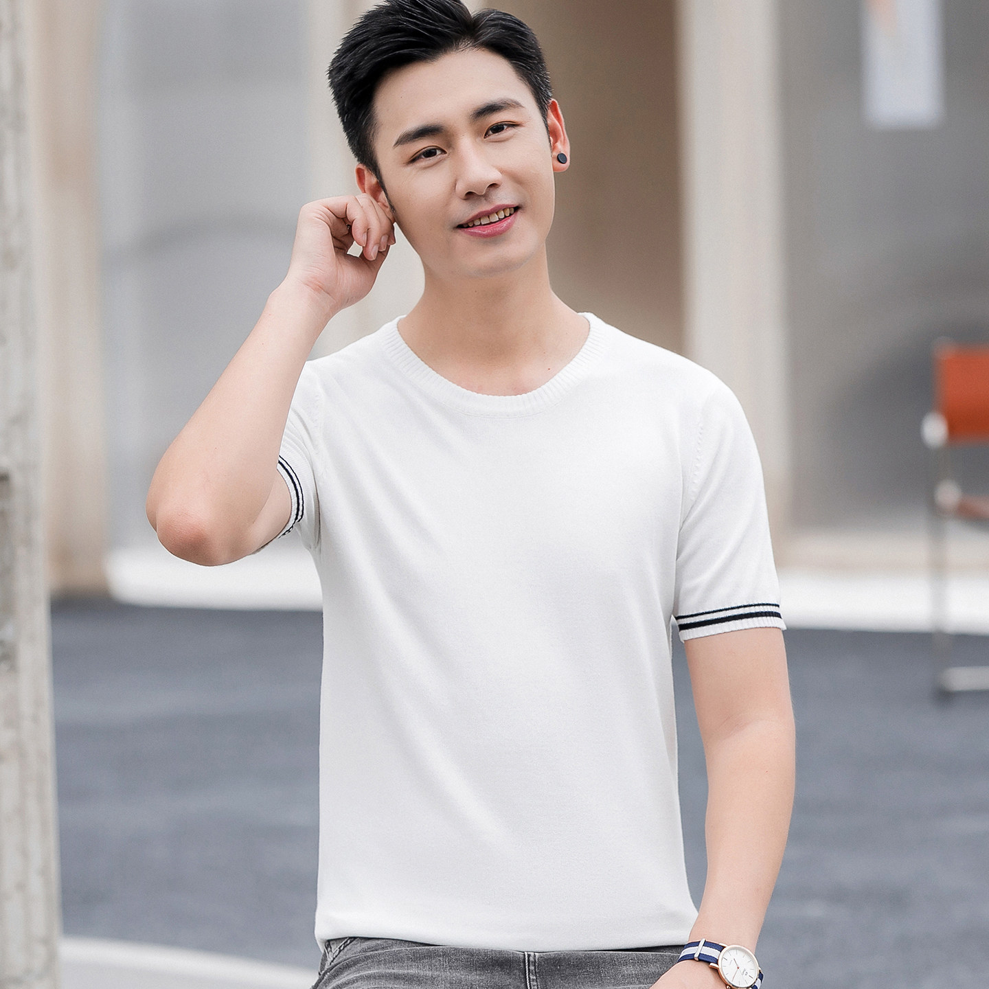春秋短袖针织衫男潮流修身半截袖T恤白色打底衫冰丝薄款半袖毛衣