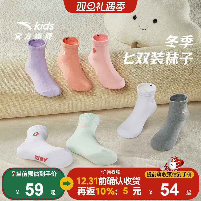 安踏儿童袜子秋冬2025新精梳棉七双装短袜子男童运动跑步袜子女童