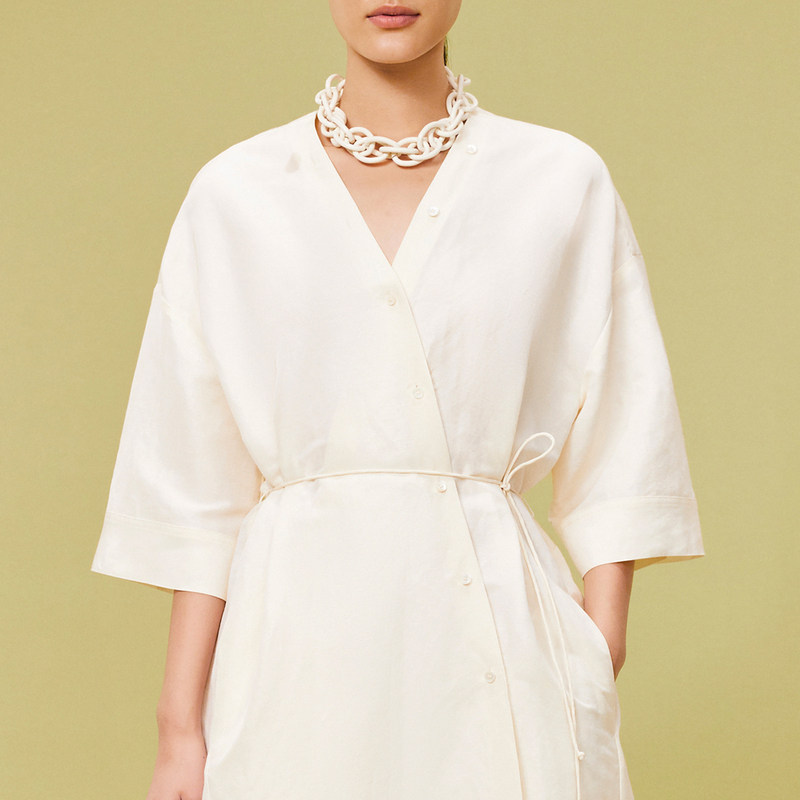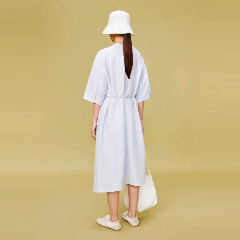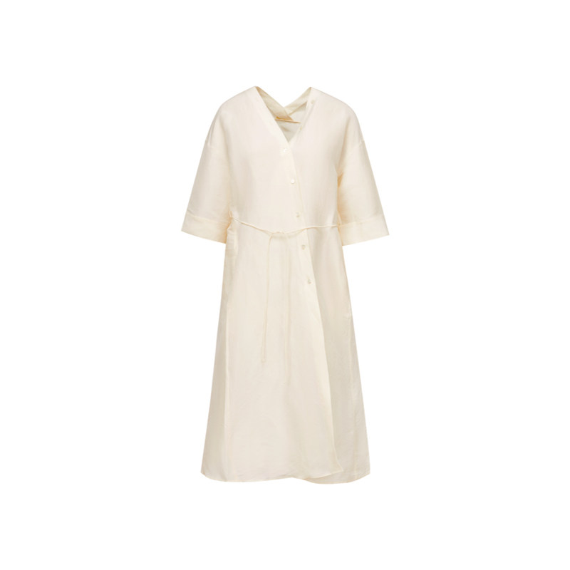 LESS夏季通勤气质V领系带长裙丝麻平纹设计感短袖连衣裙2O6G11060