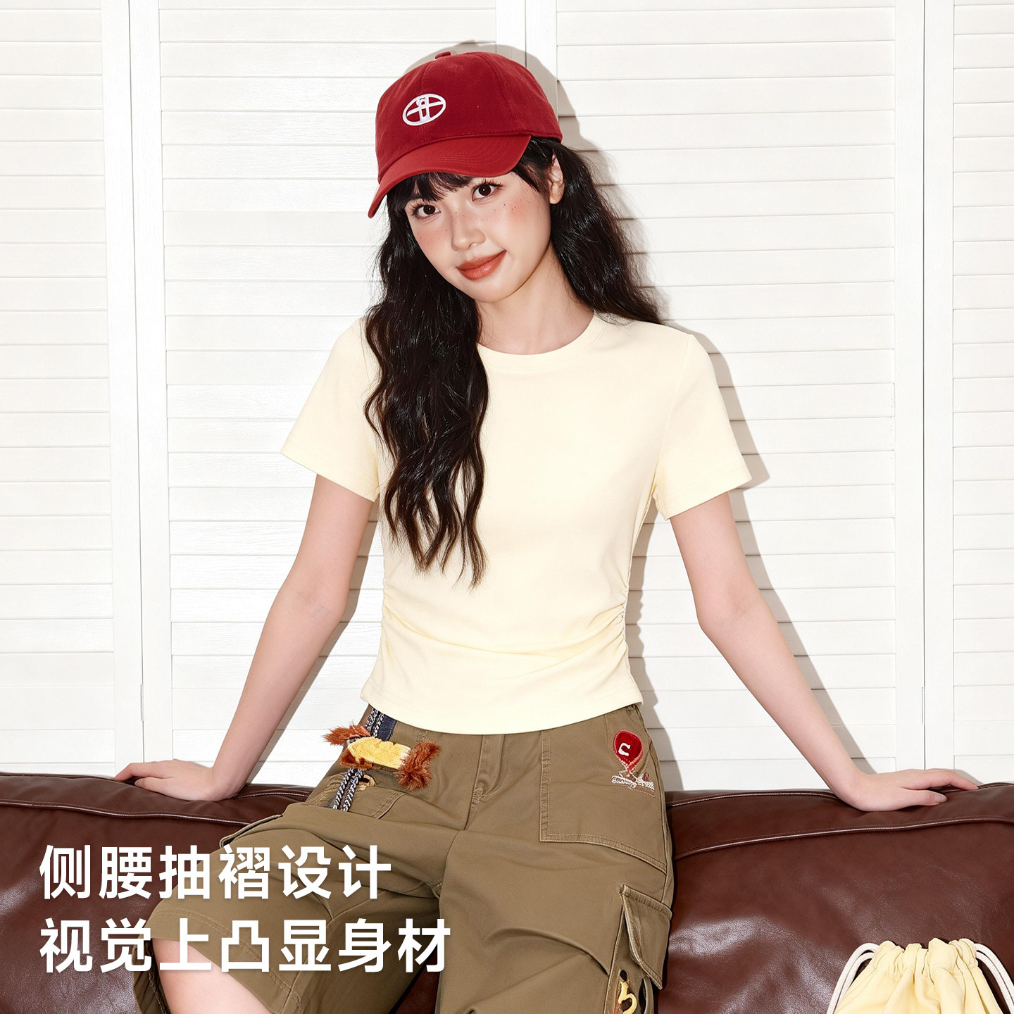 唐狮官方正肩短袖女t恤2026新款夏季修身抽褶显瘦半袖黑色上衣VC