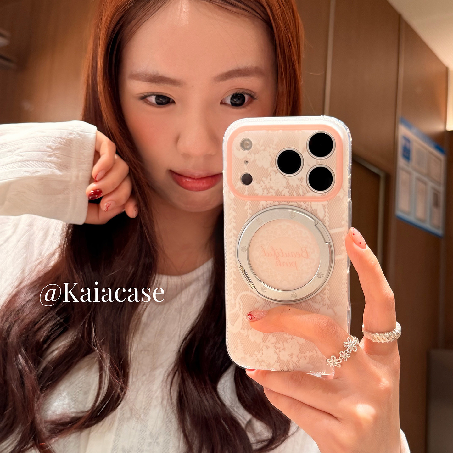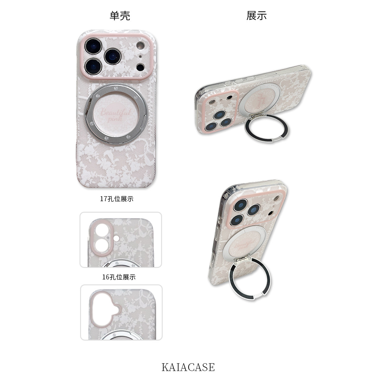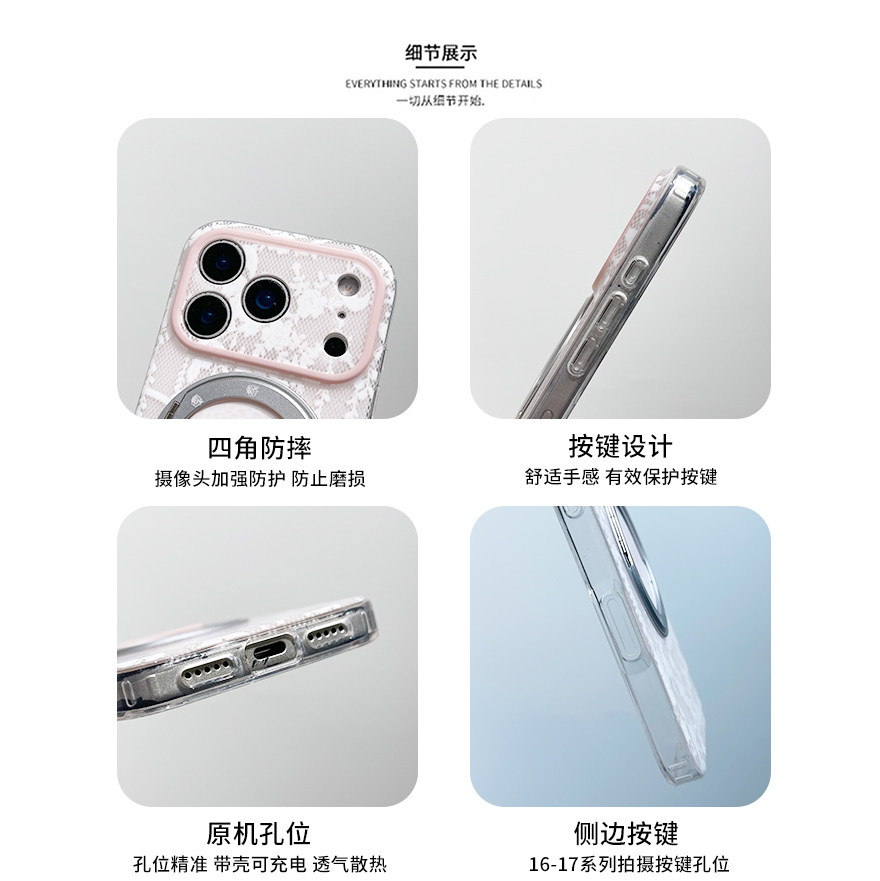 kaia温柔ins甜美粉色蕾丝花纹适用苹果17promax手机壳iphone16pro新款16女17pro旋转支架15pro全包防摔手机套