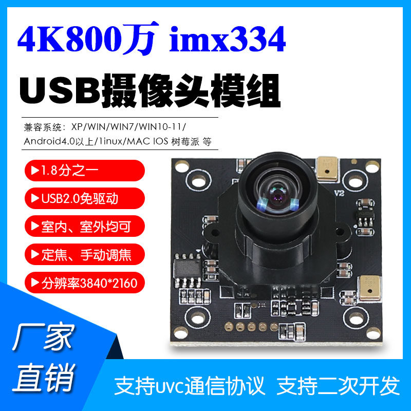 4K800万imx334高清工业机器视觉相机广角无畸变USB摄像头PCBA模组