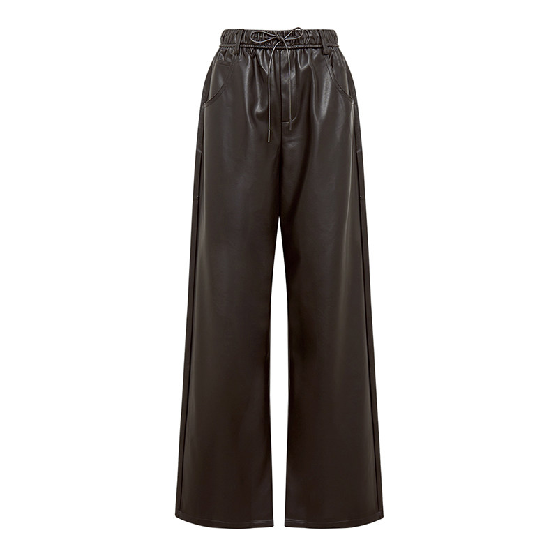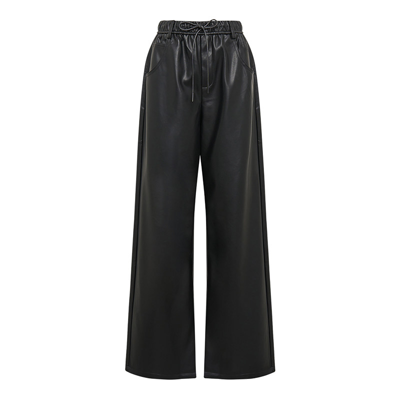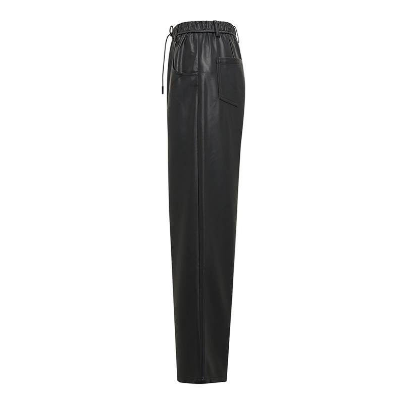 Petit Bari率性垂坠抽绳直筒休闲皮裤黑色皮裤高腰设计 宽松阔腿