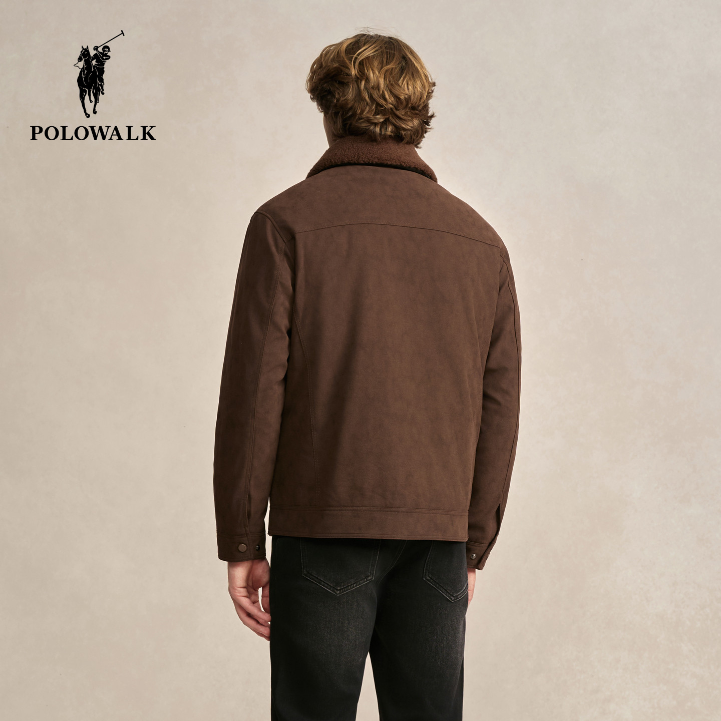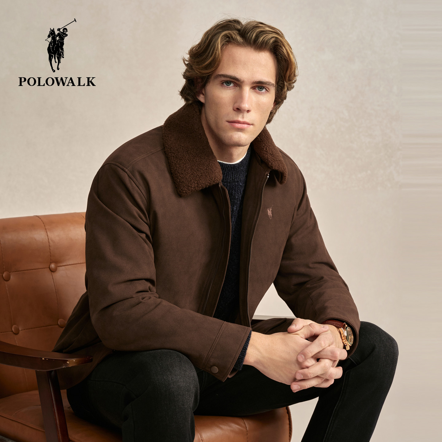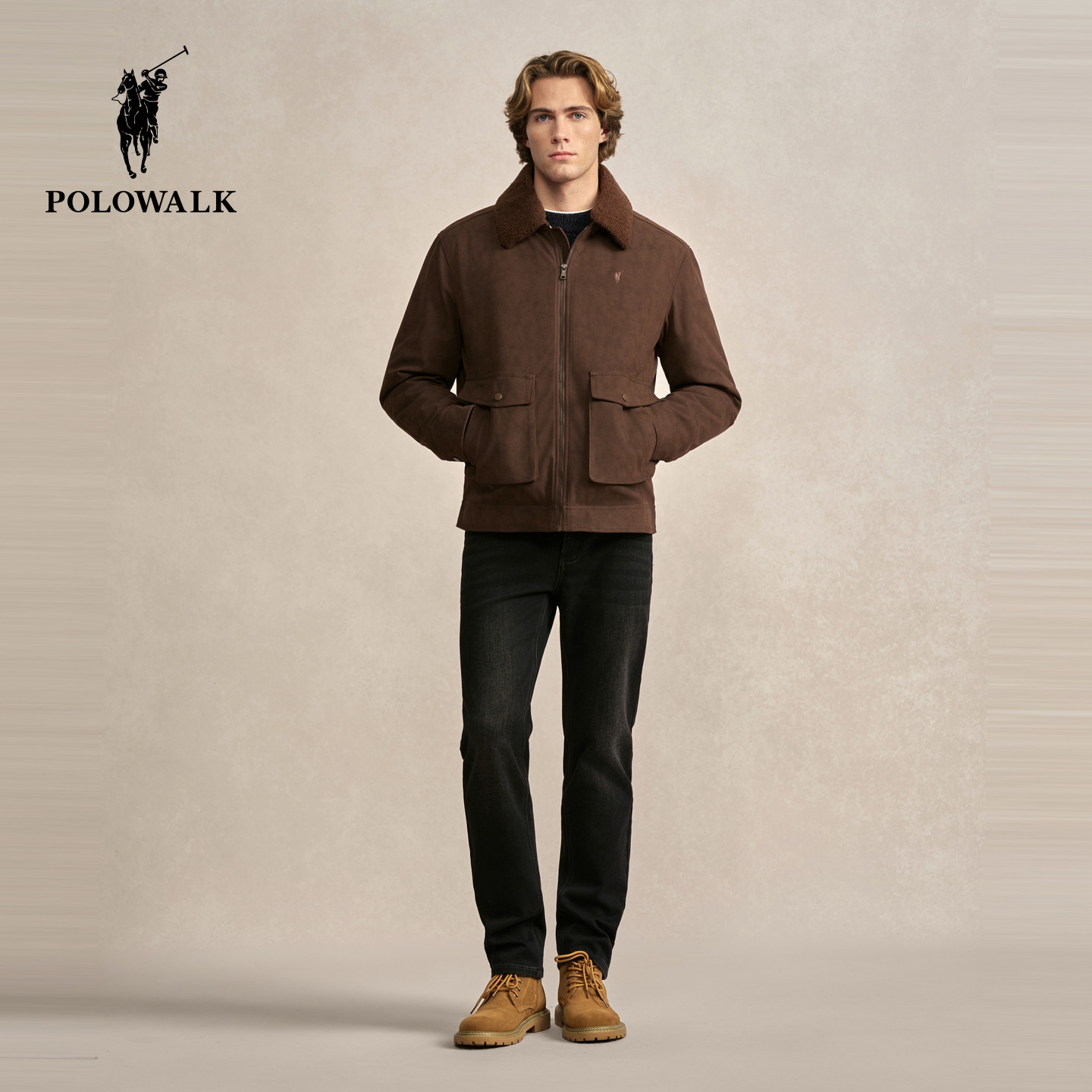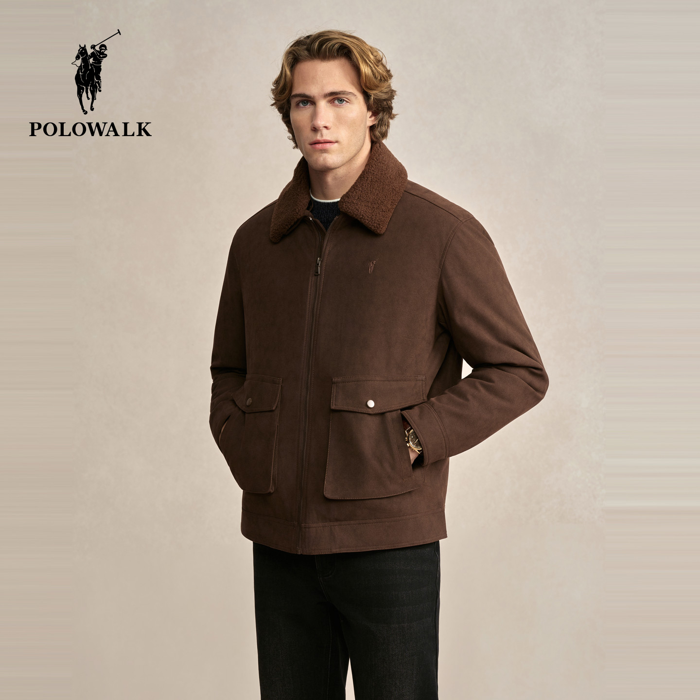 POLOWALK男式皮衣2025冬季新品复古工装风通勤翻领皮衣毛领外套