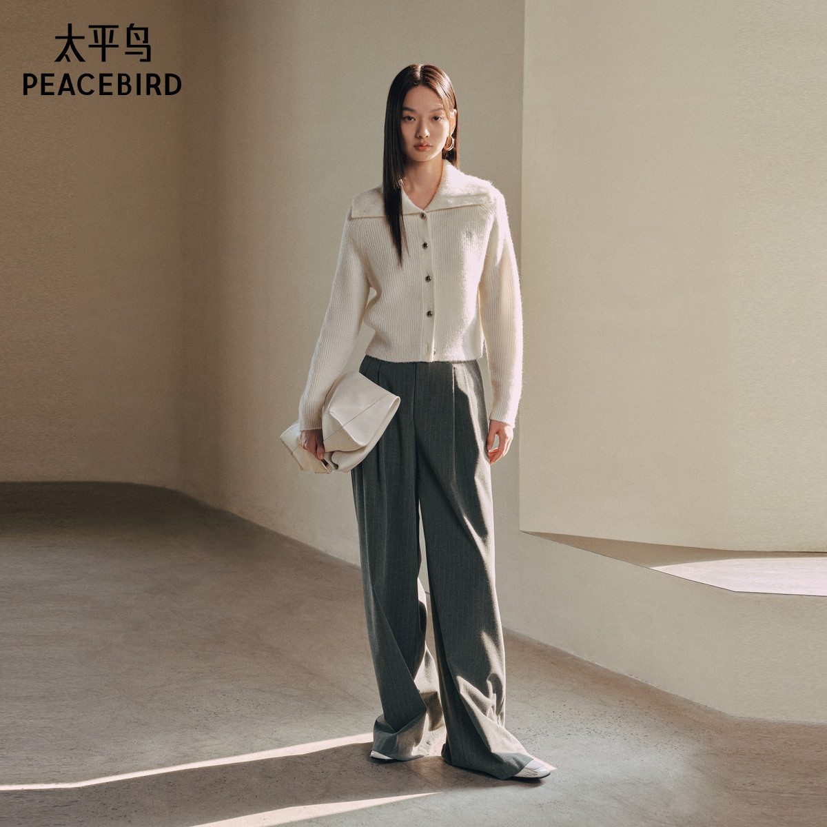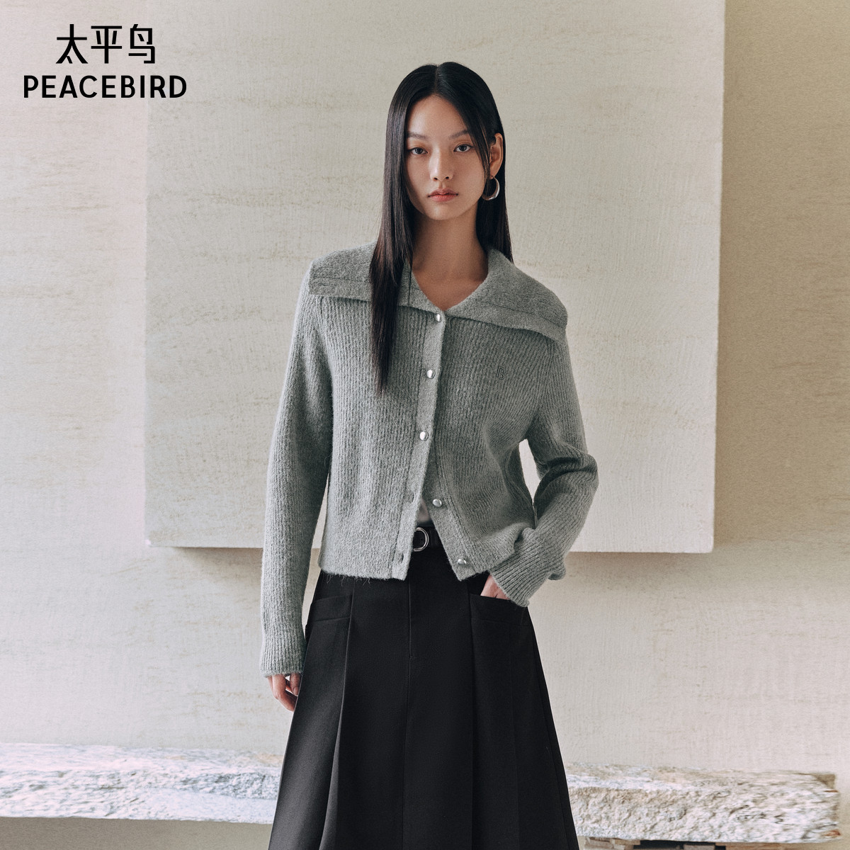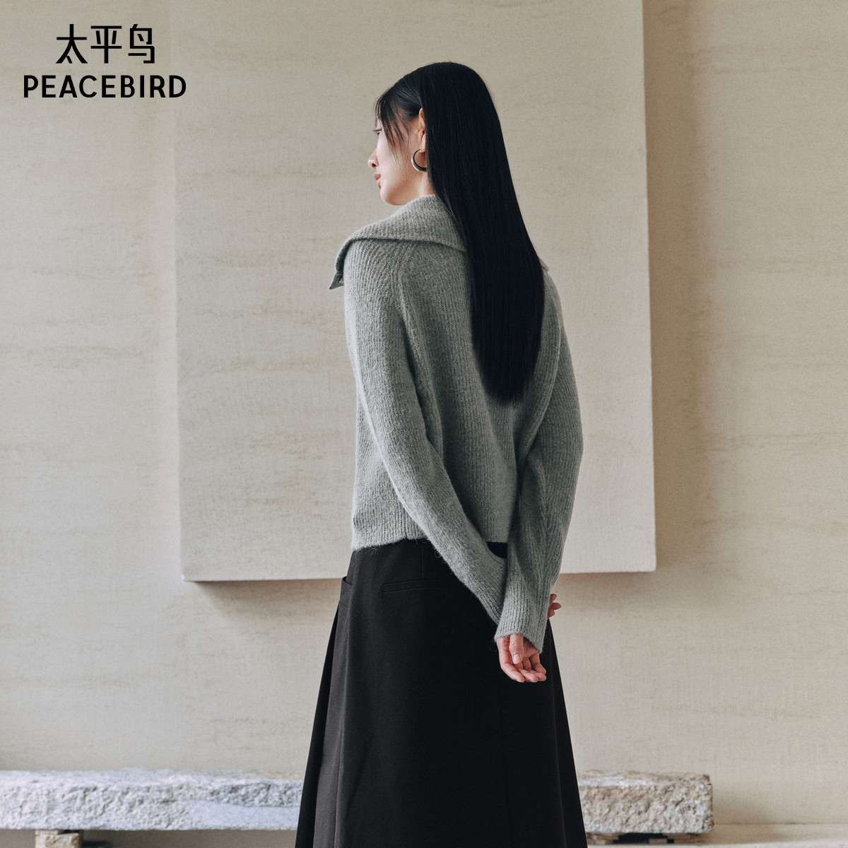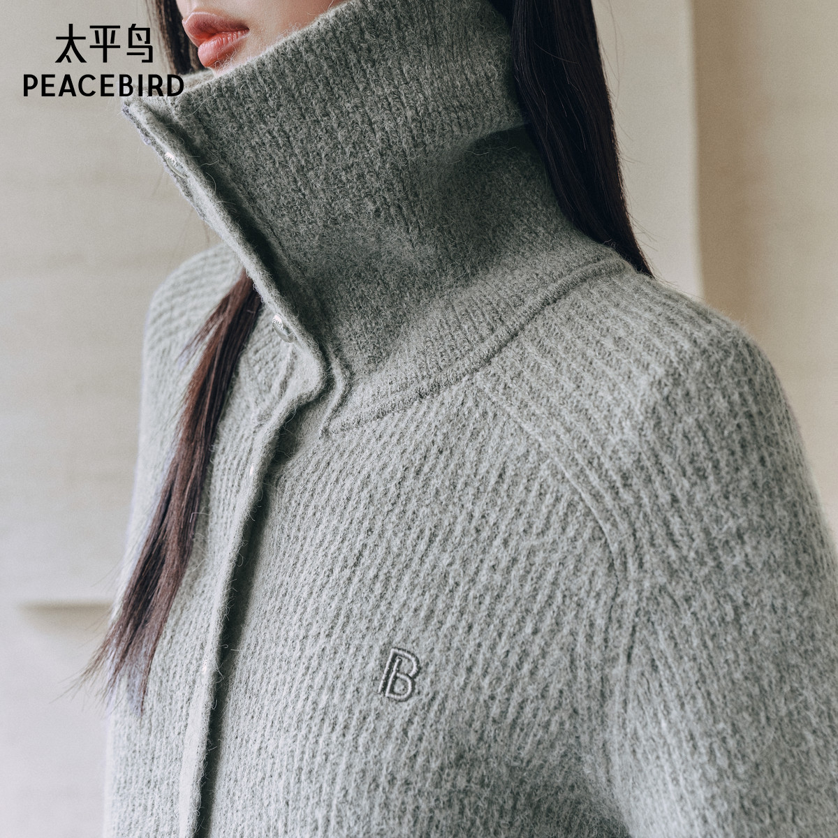 太平鸟绵羊毛混马海毛拉毛纱大翻领针织开衫女冬款毛衣外套*