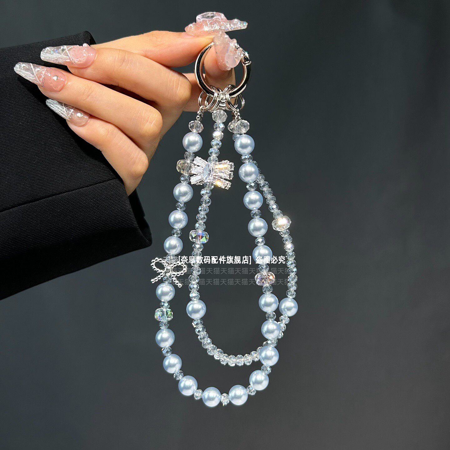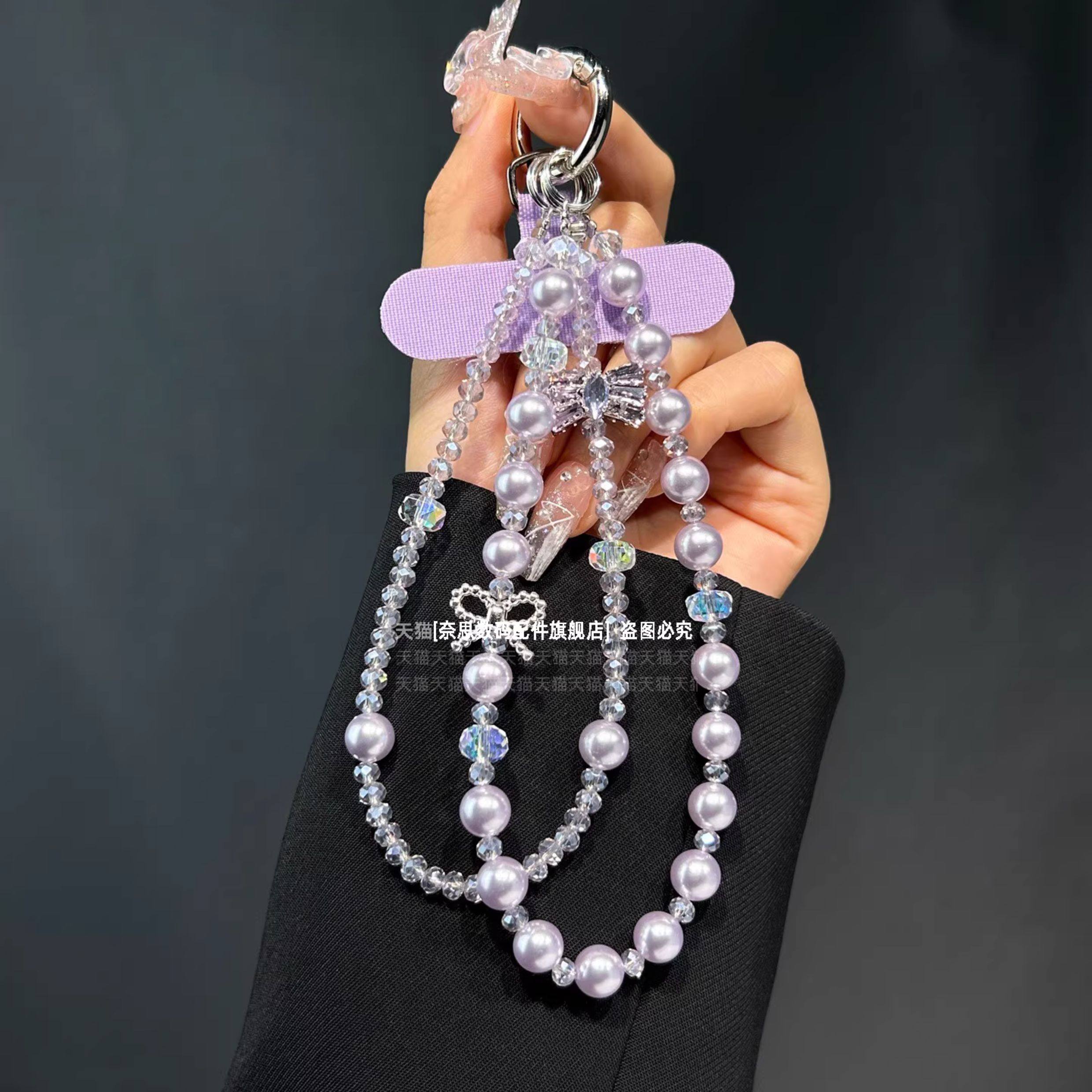 超闪极光珍珠手机链双层水晶短款链条精致水钻蝴蝶结手提挂链手腕防丢挂饰气质女神包包钥匙扣挂件手链垫片壳
