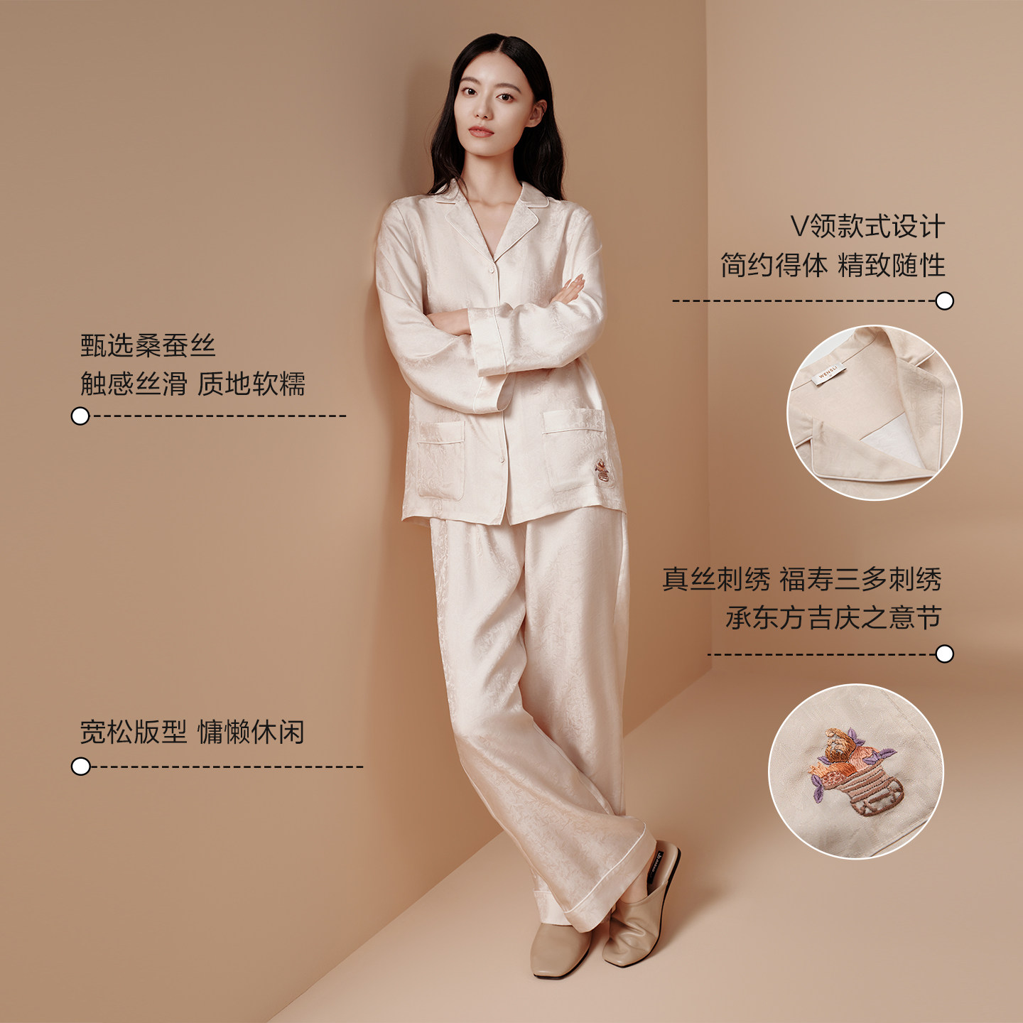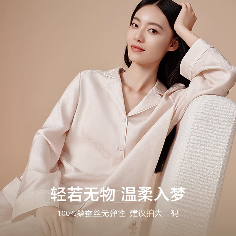 万事利新款桑蚕丝真丝睡衣简约纯色刺绣家居上下套休闲男女款嘉运