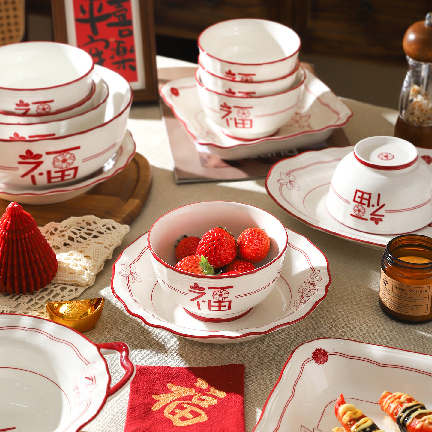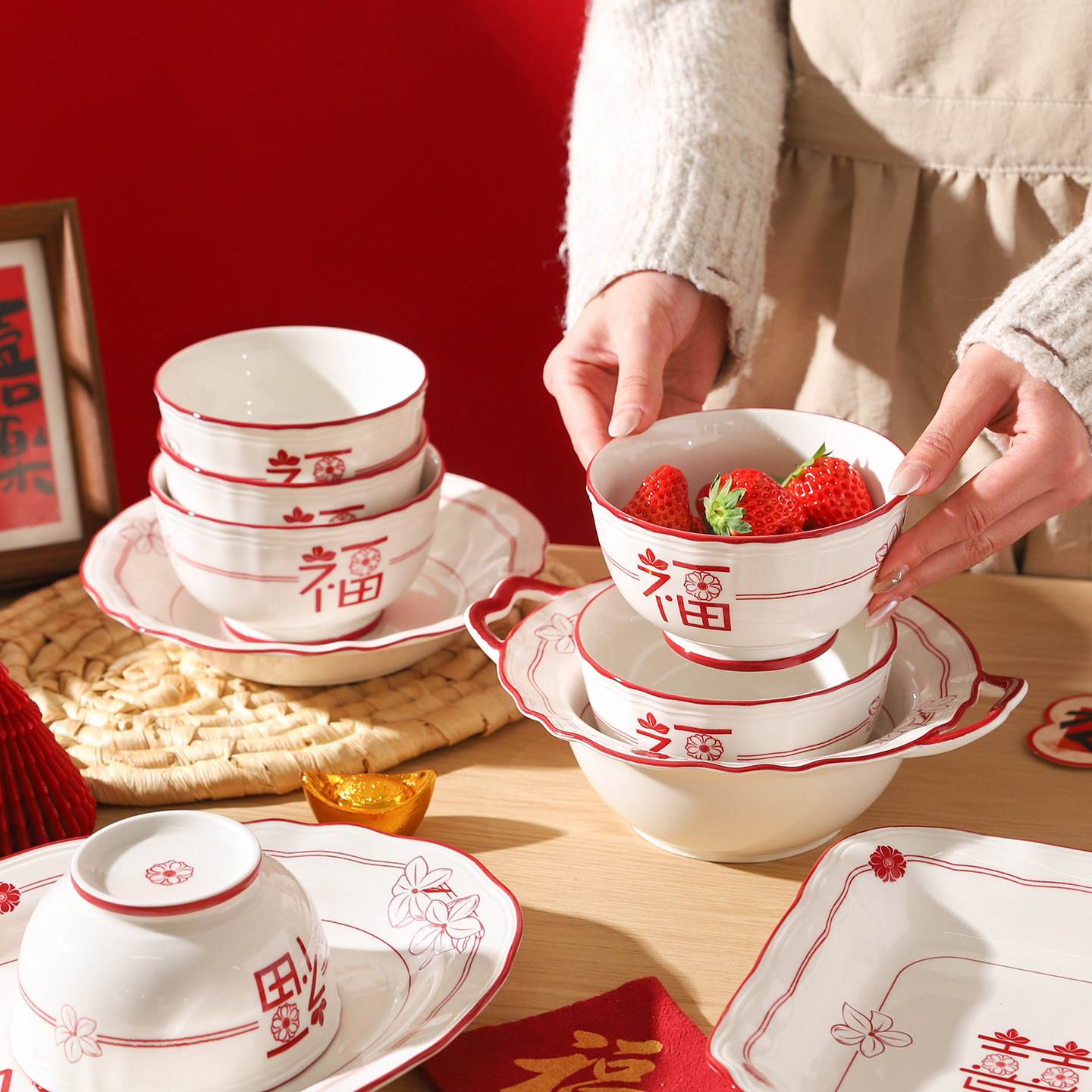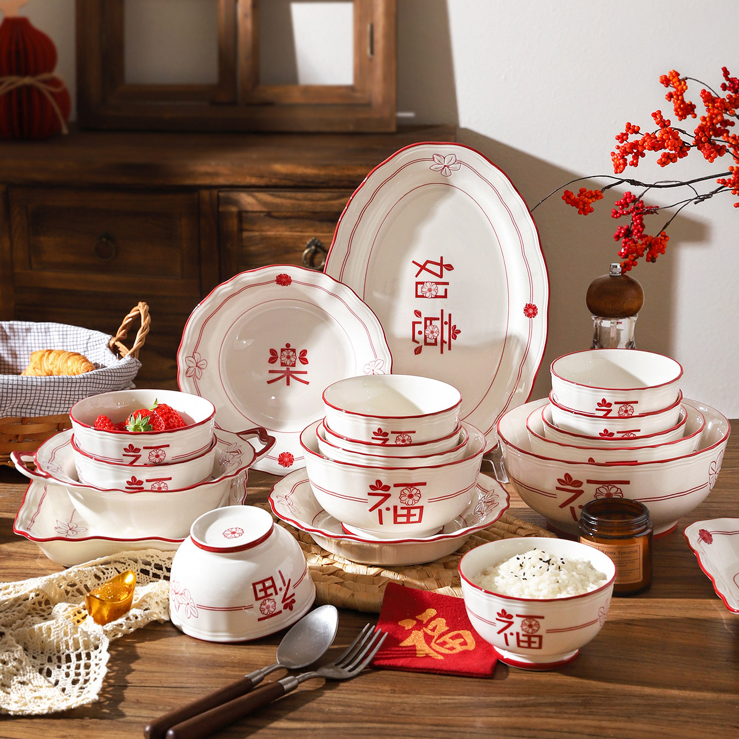 舍里福字陶瓷碗盘套装中式釉下彩餐具家用米饭碗高颜值碗碟菜盘子