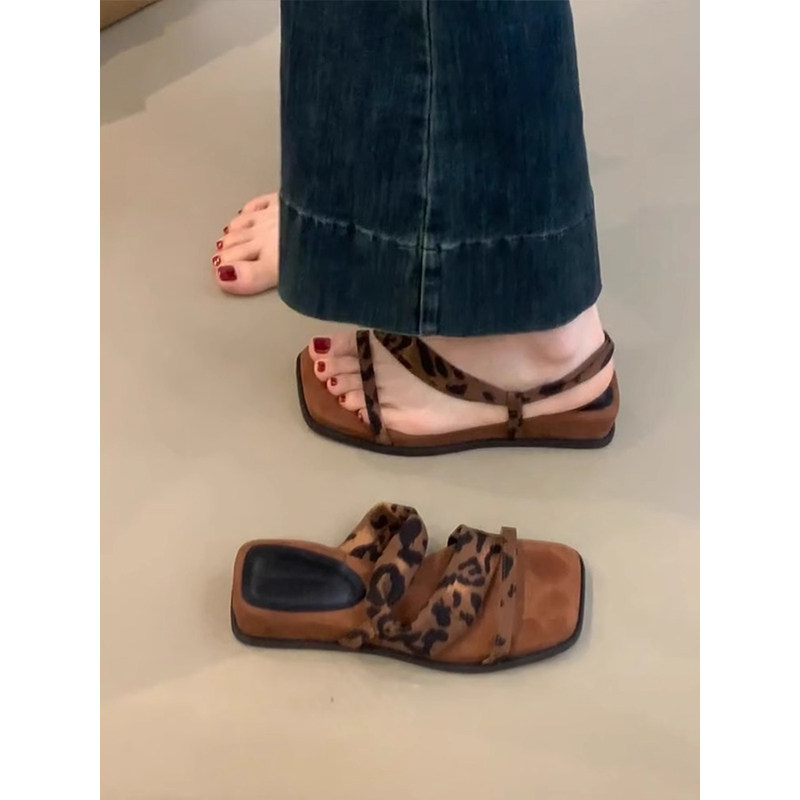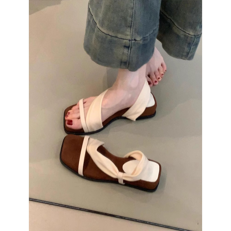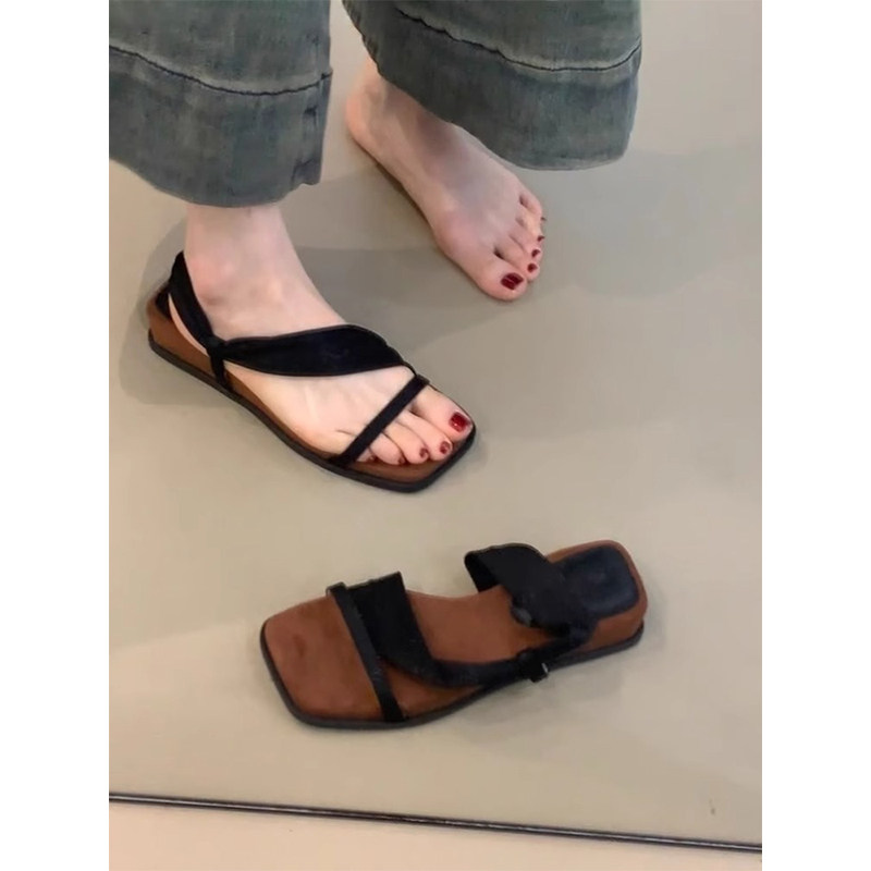 【离不凡】2025早春新款圆头小香风拼色金属布面粗跟细带平底凉鞋