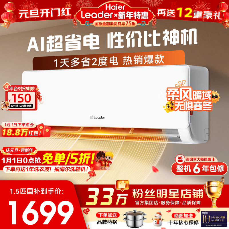 [政府补贴]海尔空调统帅1.5匹家用一级能效变频挂机LPA省电旗舰店