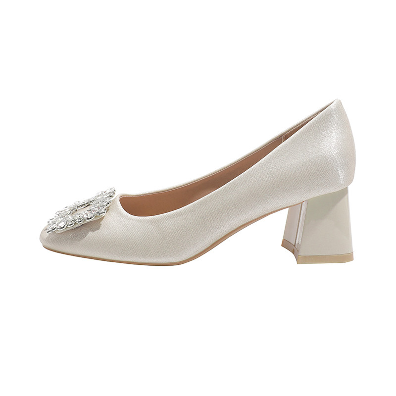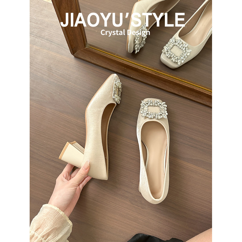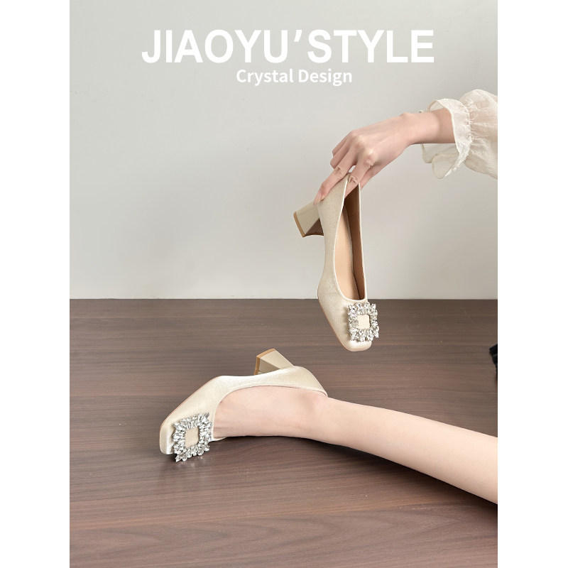 真皮~骄屿绝美水钻方扣玛丽珍鞋法式单鞋女配裙子绸缎浅口高跟鞋