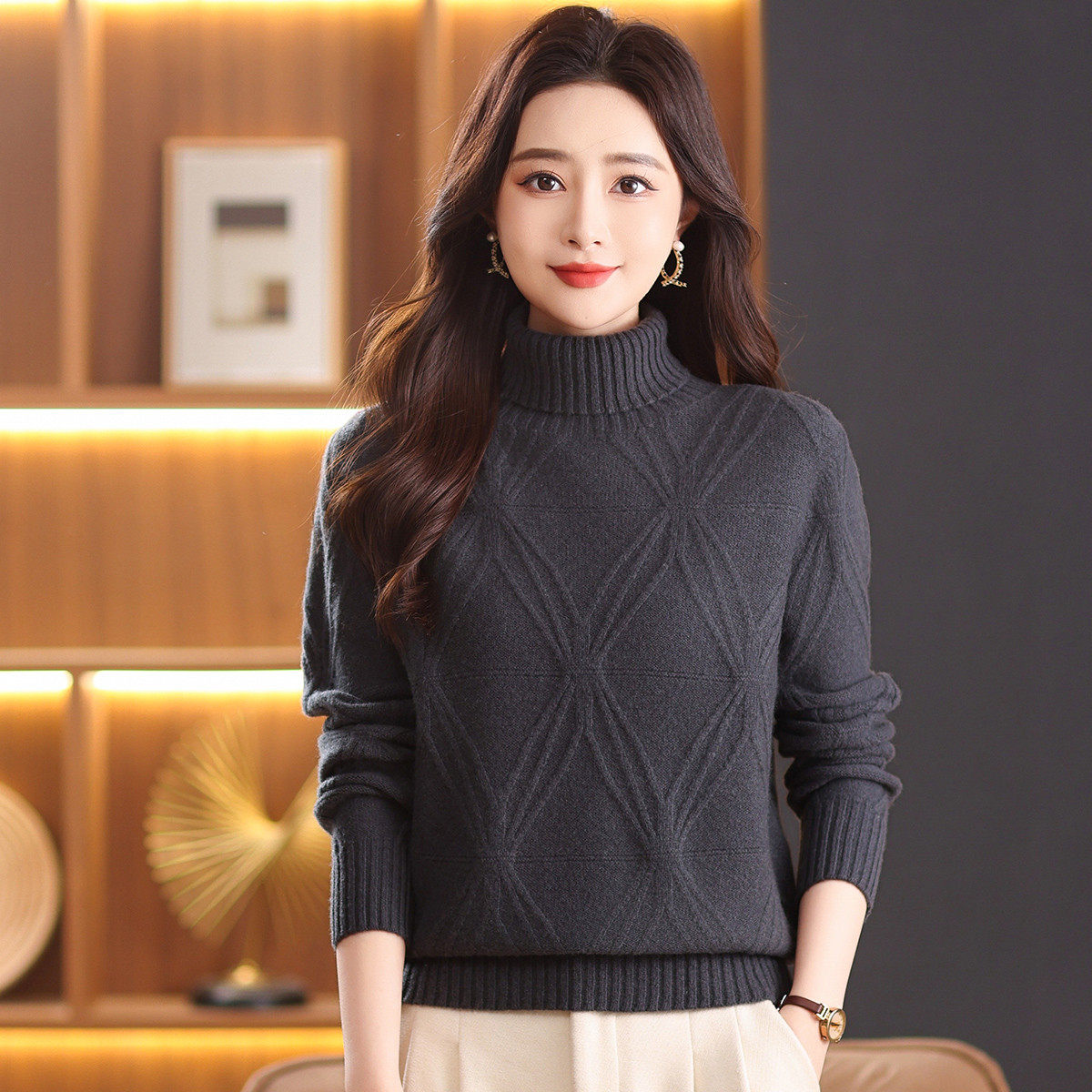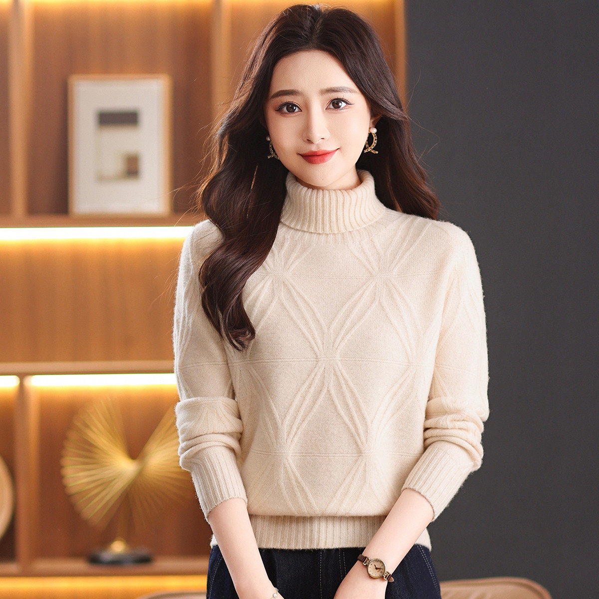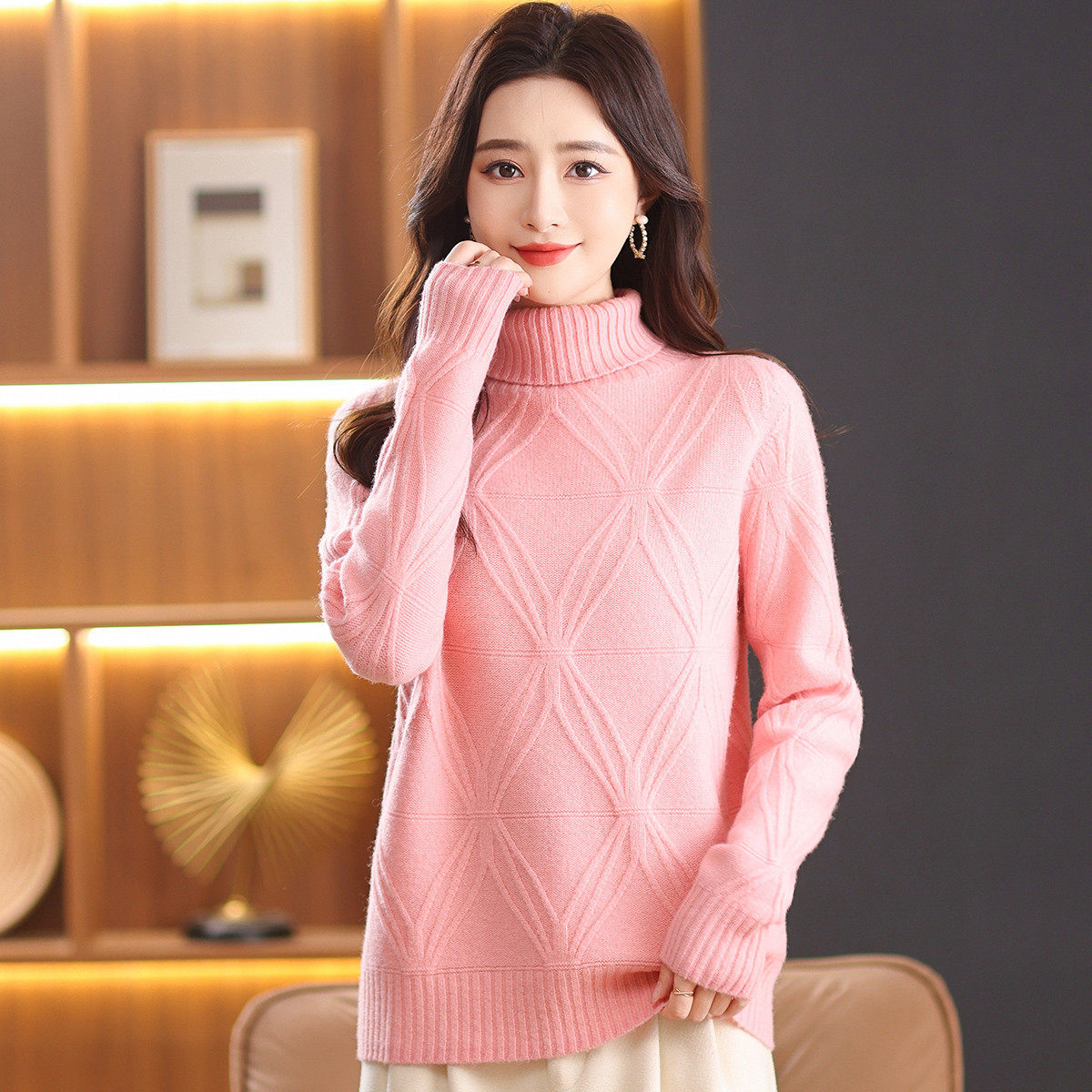 100%绵羊毛温柔风加厚高领毛衣女秋冬新品高级感提花针织上衣