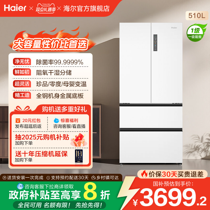 海尔冰箱以旧换新补贴510L法式双开一级能效无霜大容冰箱家用官方