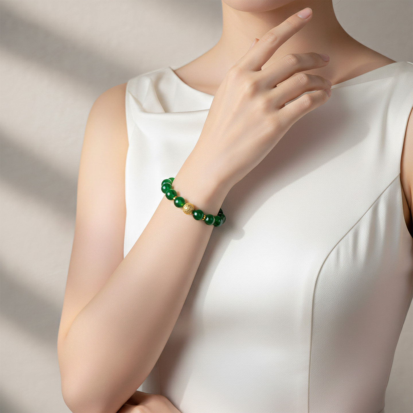 AILEQ 925银天然玉髓绿珠串玉绿金色银辉新中式时尚珠宝妈妈手链