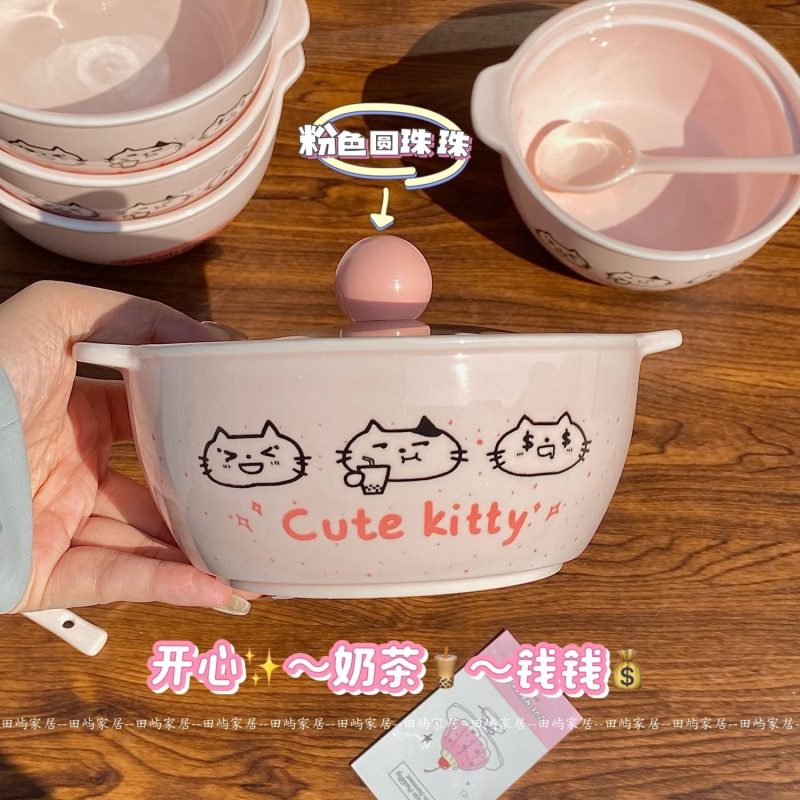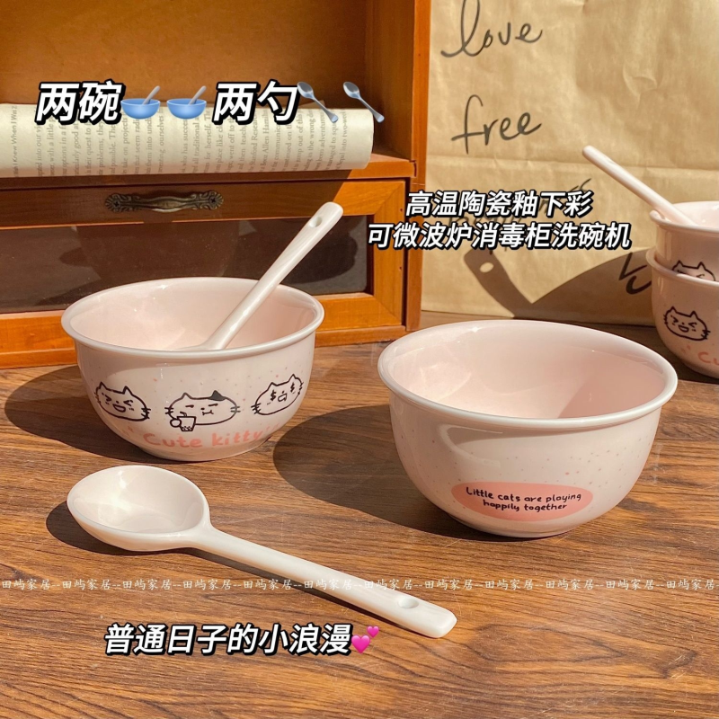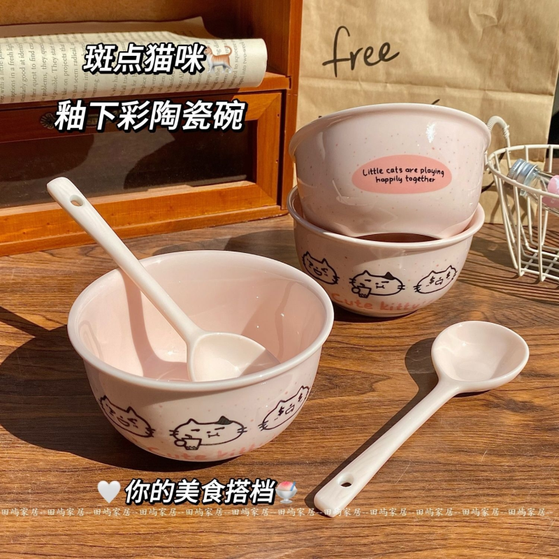 【4件套】斑点猫咪陶瓷米饭碗套装釉下彩ins高颜值宿舍餐具可爱