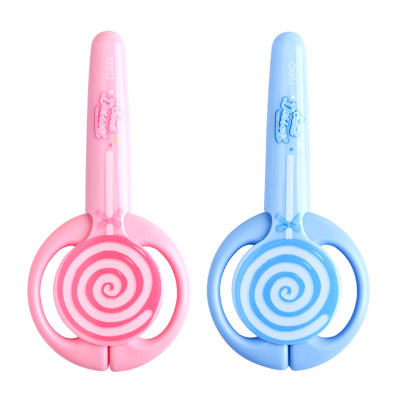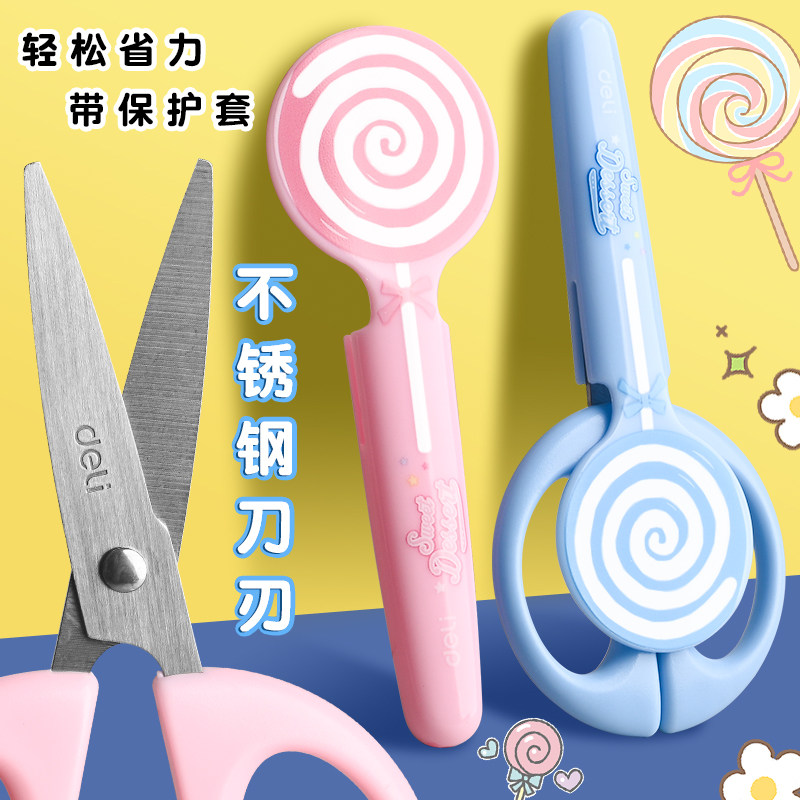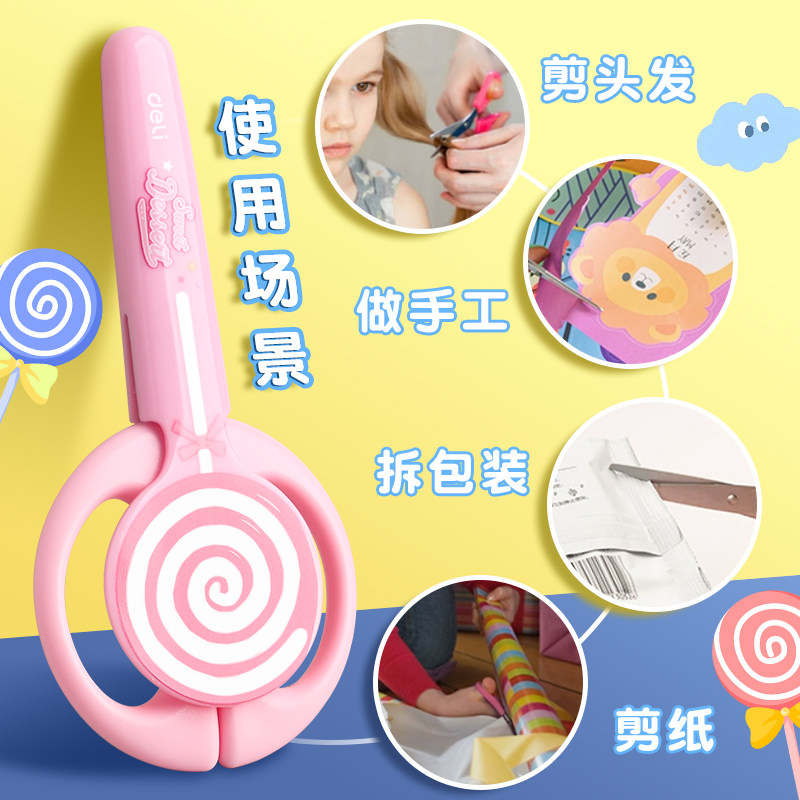 得力棒棒糖儿童剪刀安全手工带护套剪刀小型卡通小剪刀带保护套幼儿宝宝圆头剪刀安全手工幼儿园专用