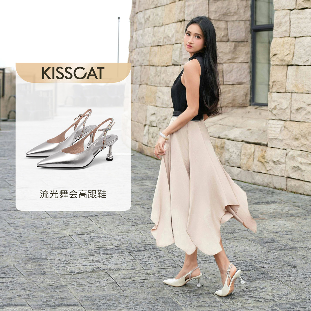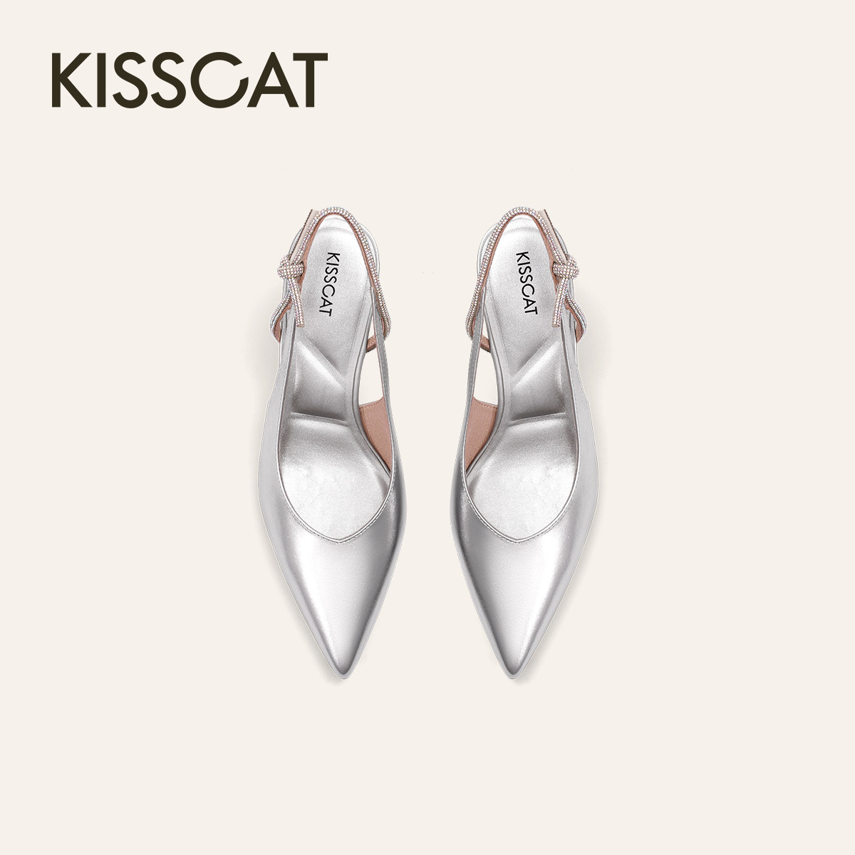 KISSCAT接吻猫[流光舞会]后空鞋春季尖头细跟时装单鞋银色高跟鞋