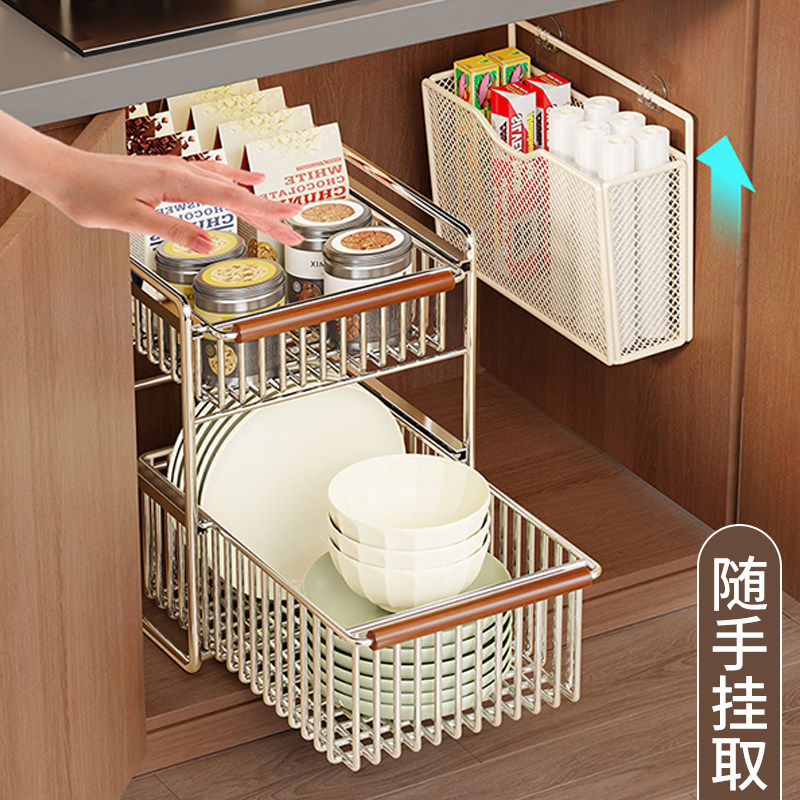 厨房吊柜门下置物架悬挂吊篮挂架分层储物架挂纸巾保鲜膜收纳架子