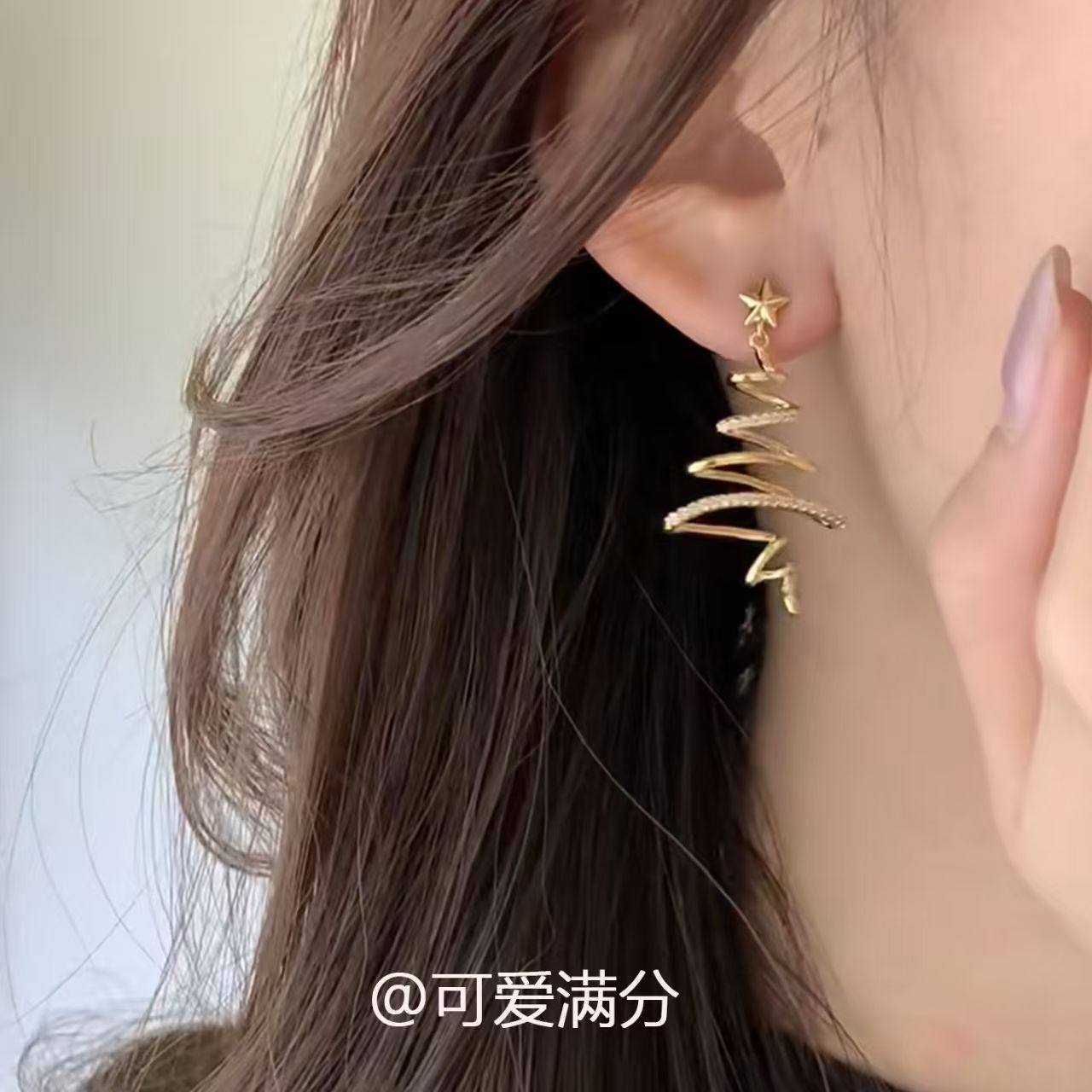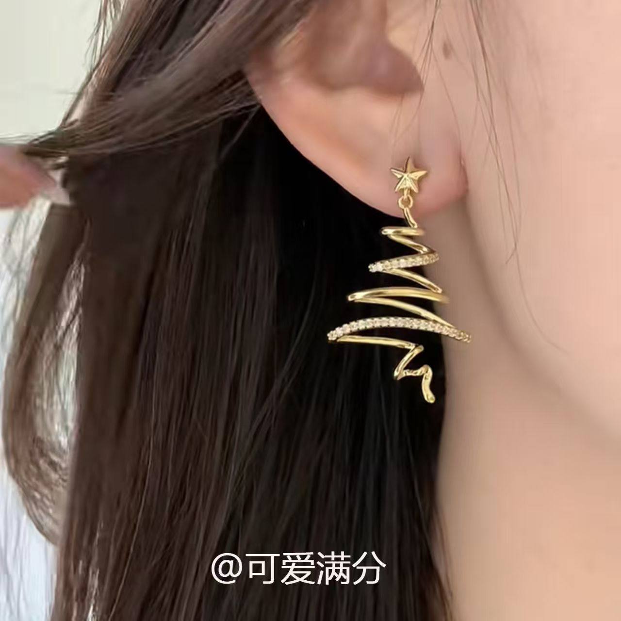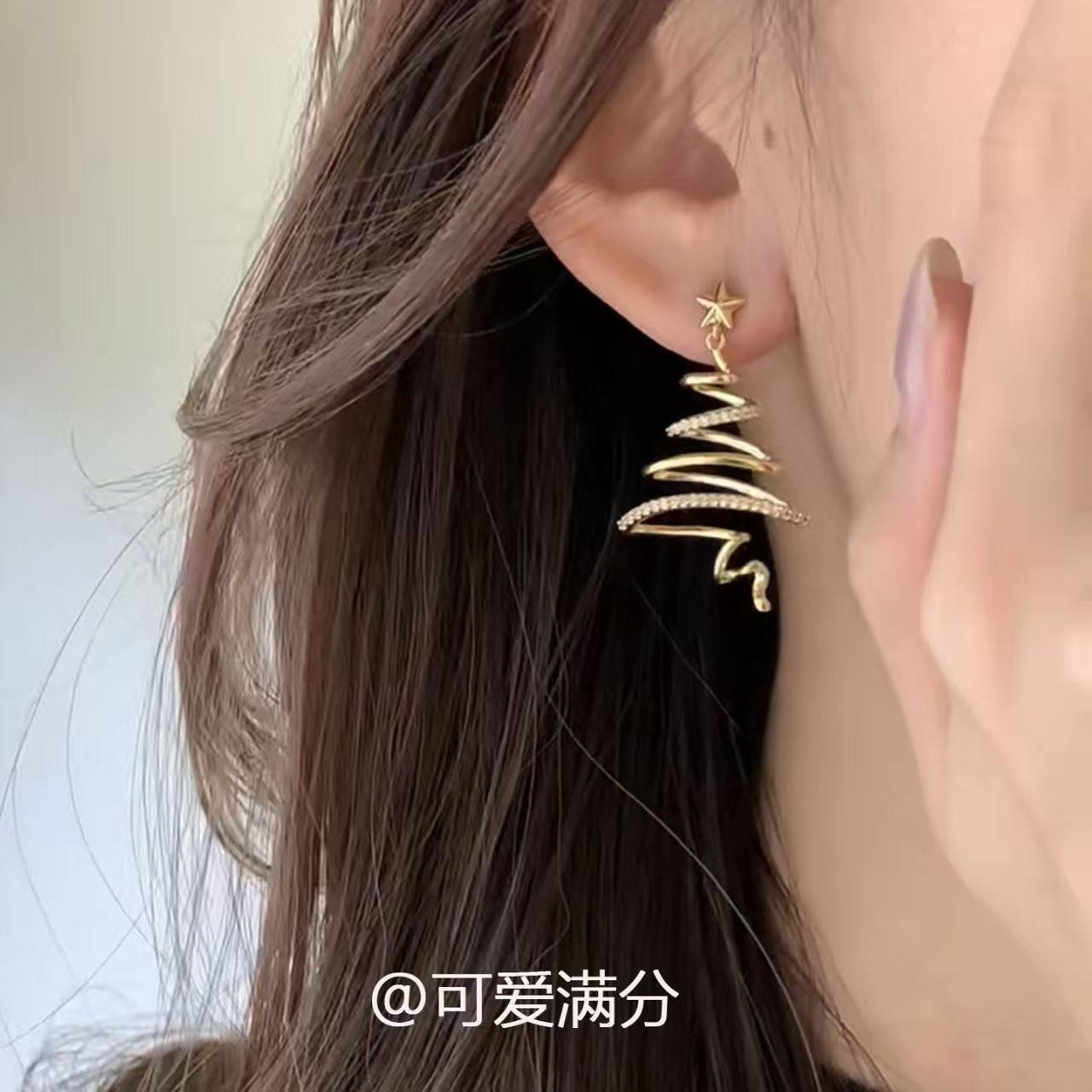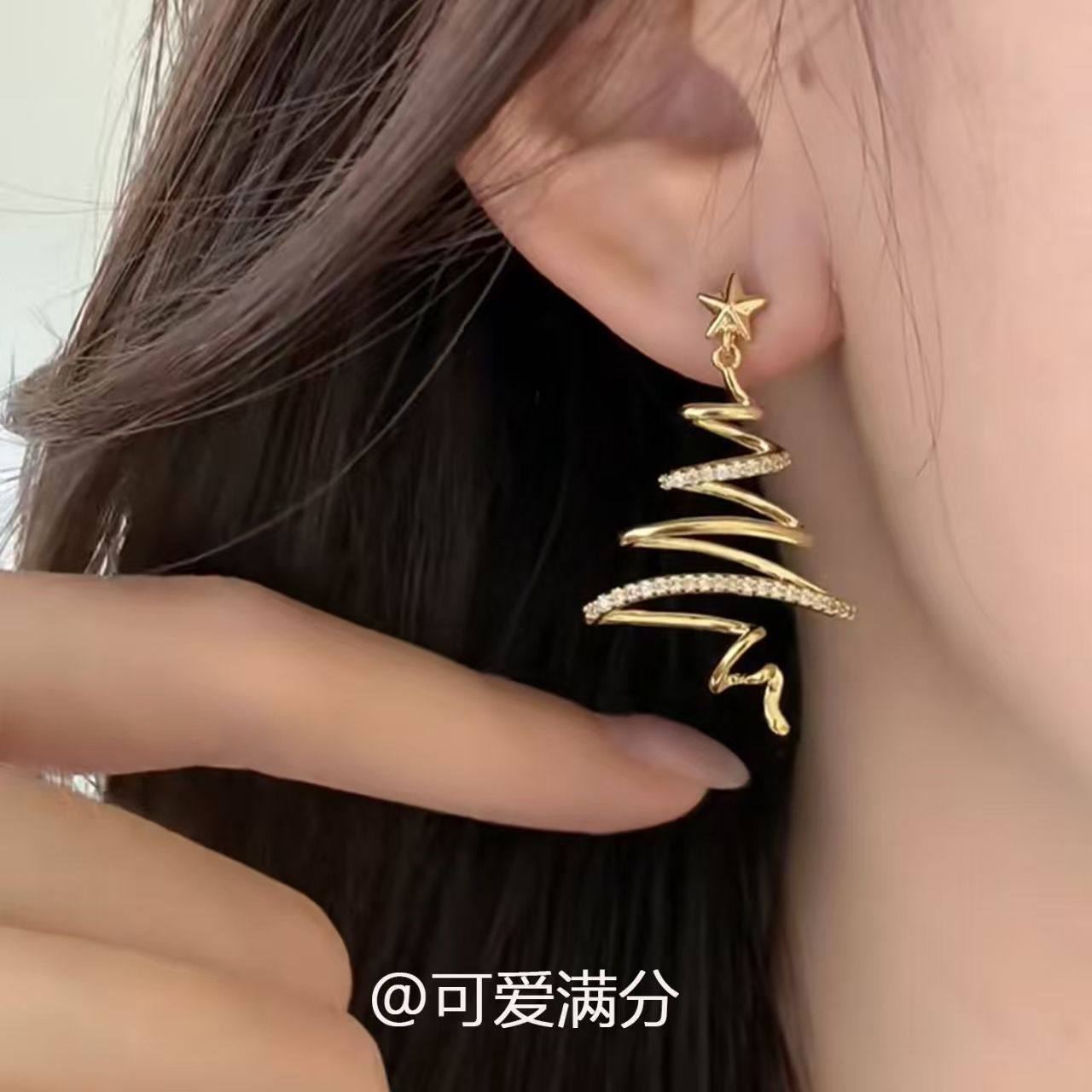 「暖冬物语」复古金色爆闪圣诞树星星耳钉小众轻奢时尚圣诞节耳饰