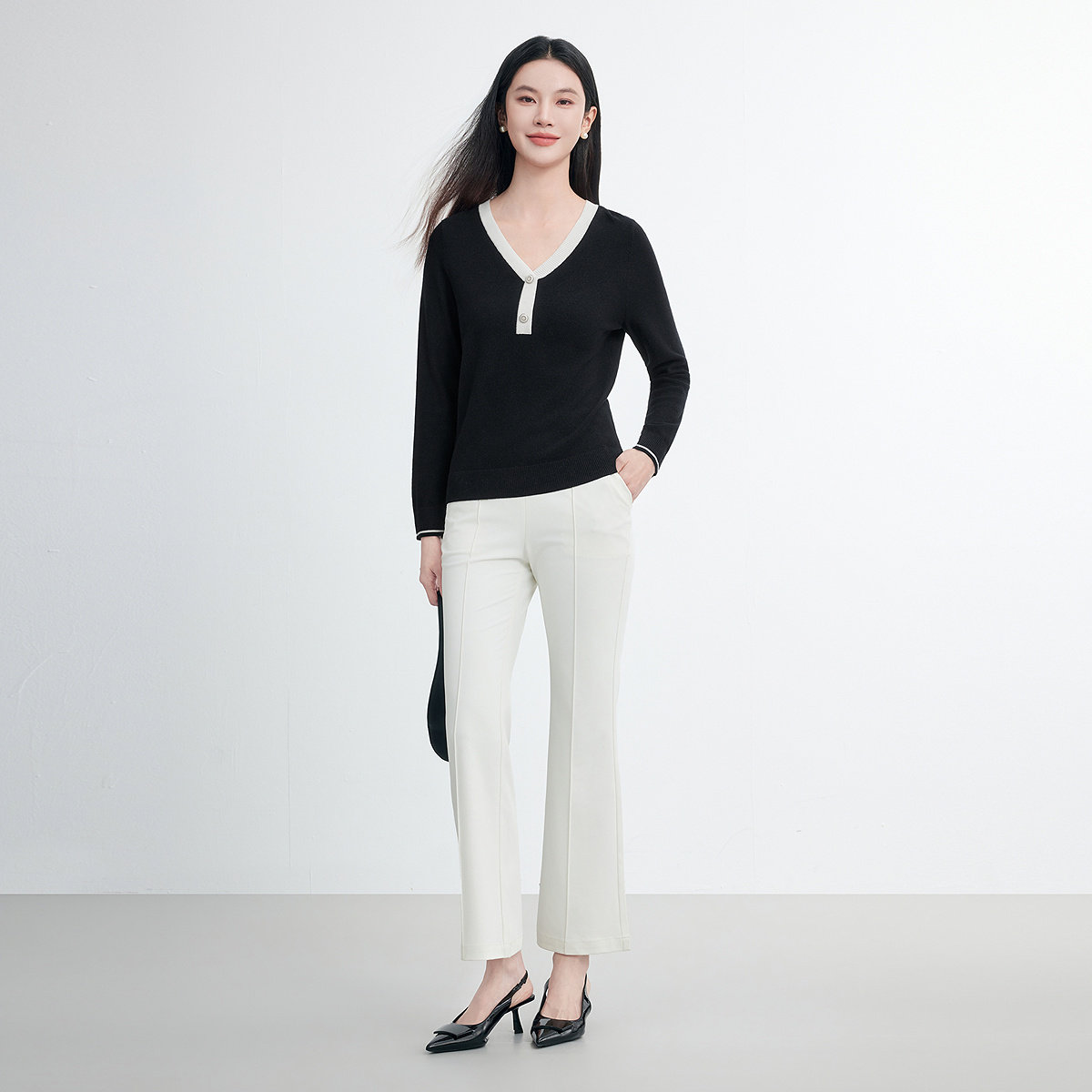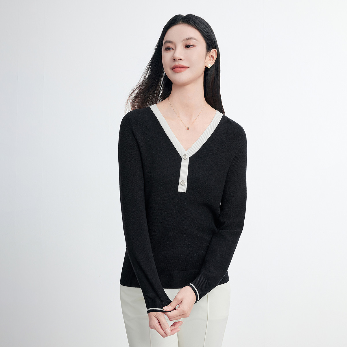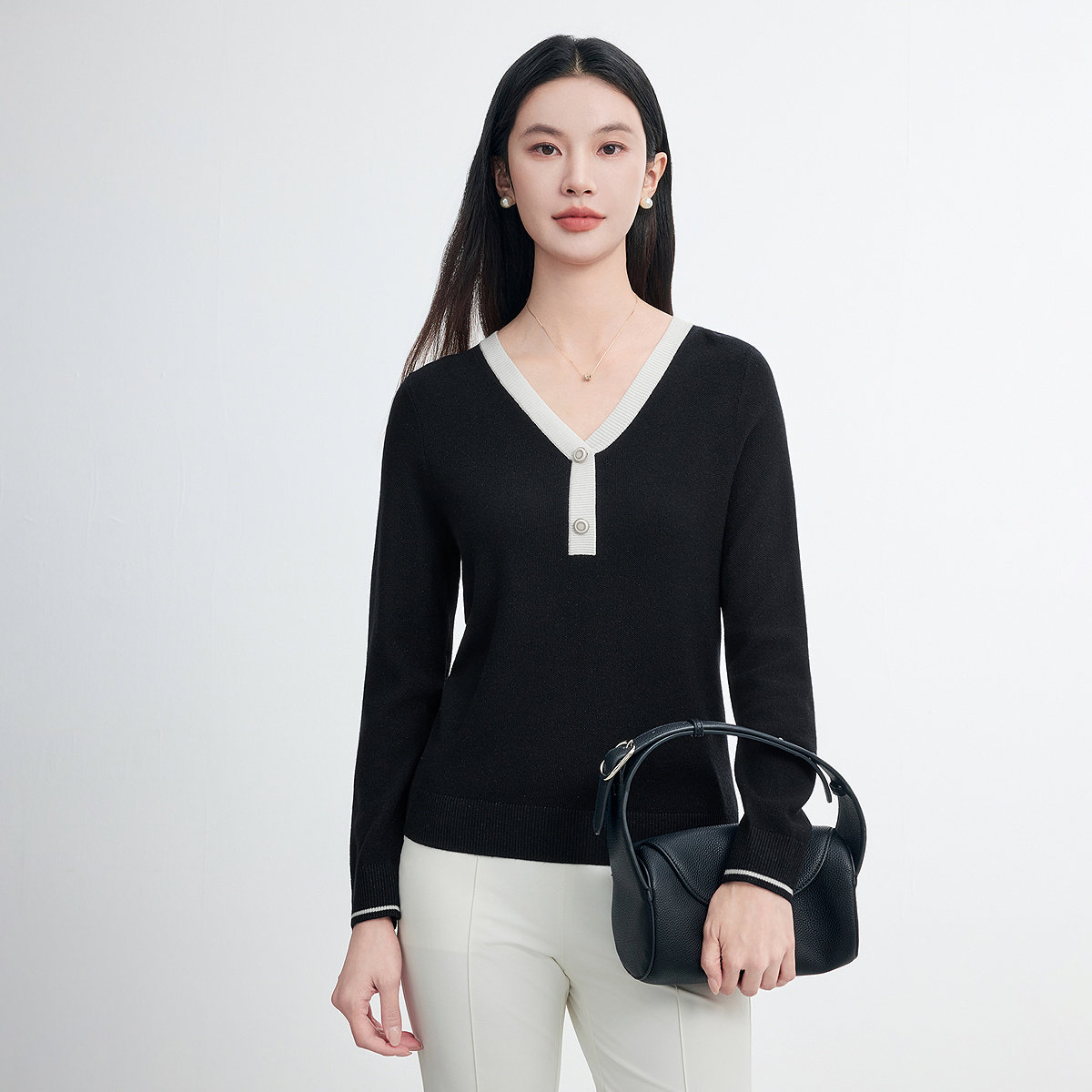 FINITY菲妮迪羊毛衫2026春季新款简约小香风V领休闲打底衫上衣女