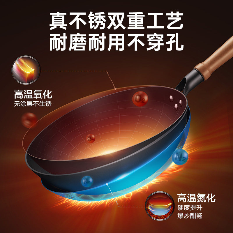 【新品】康巴赫Pro版真钛0涂层炒锅无涂层家用不粘锅不锈钢炒菜锅