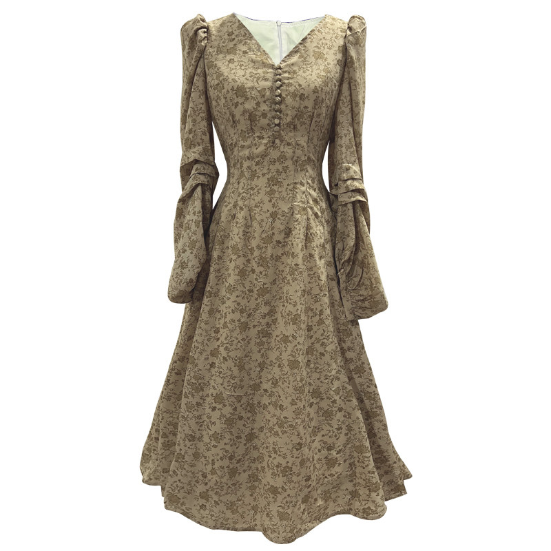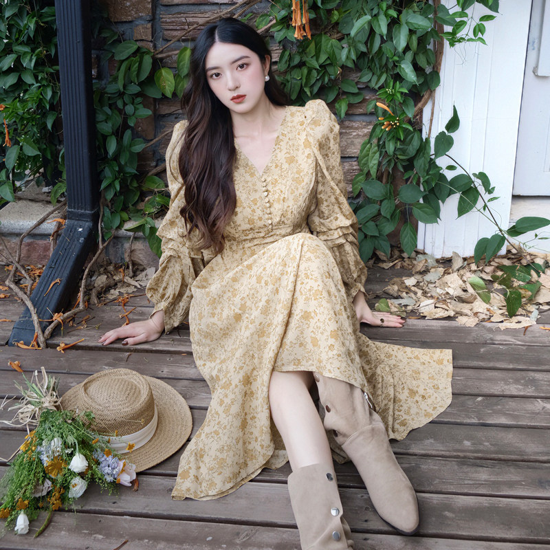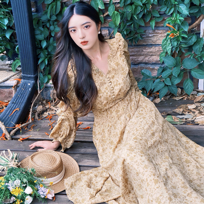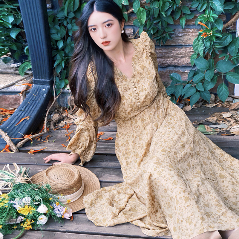 JUJU定制刘亦菲明星同款碎花连衣裙女长袖印花V领裙子显瘦裙春秋
