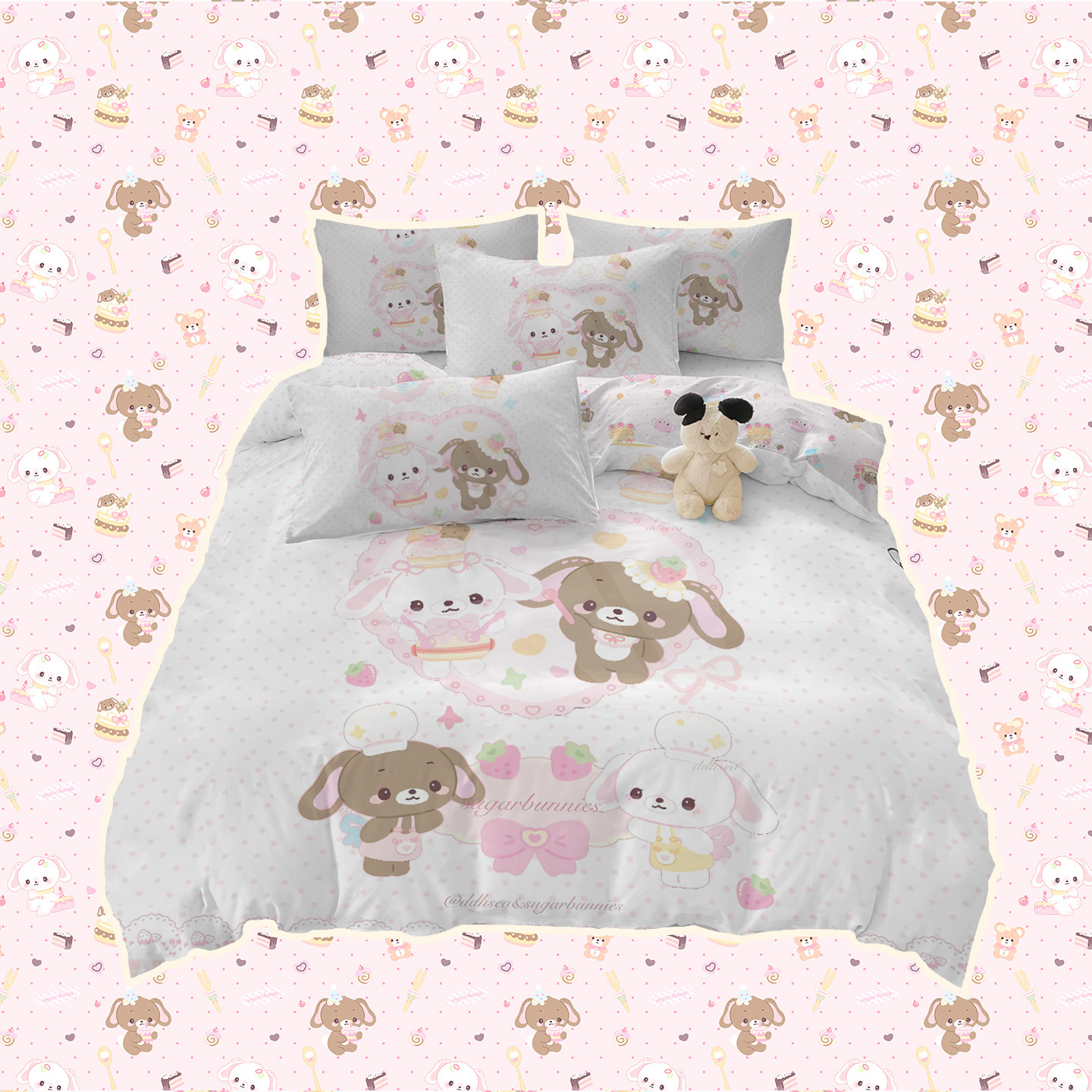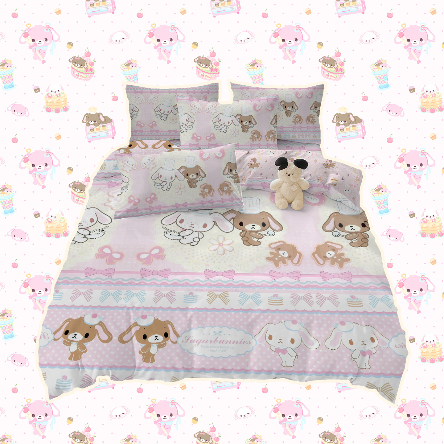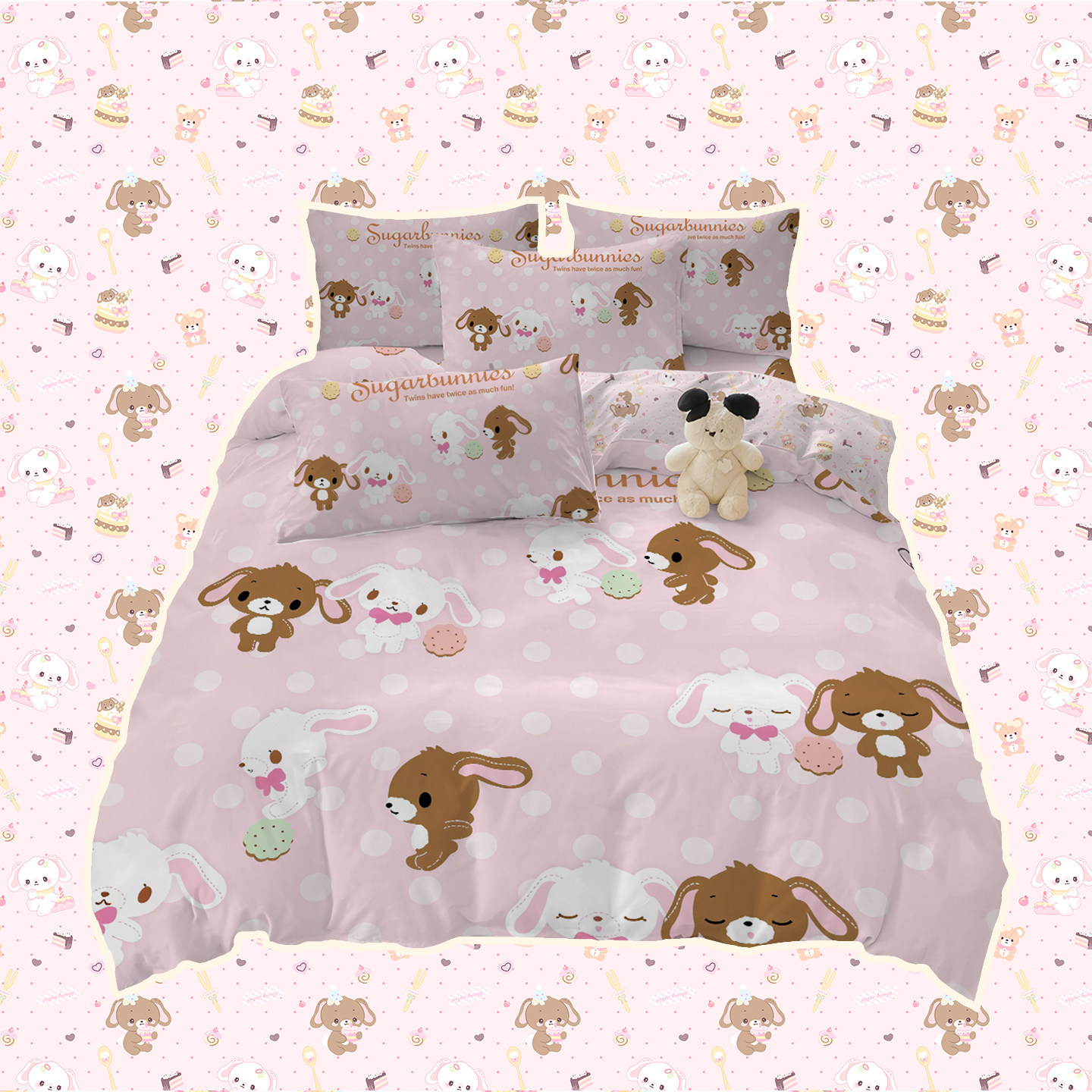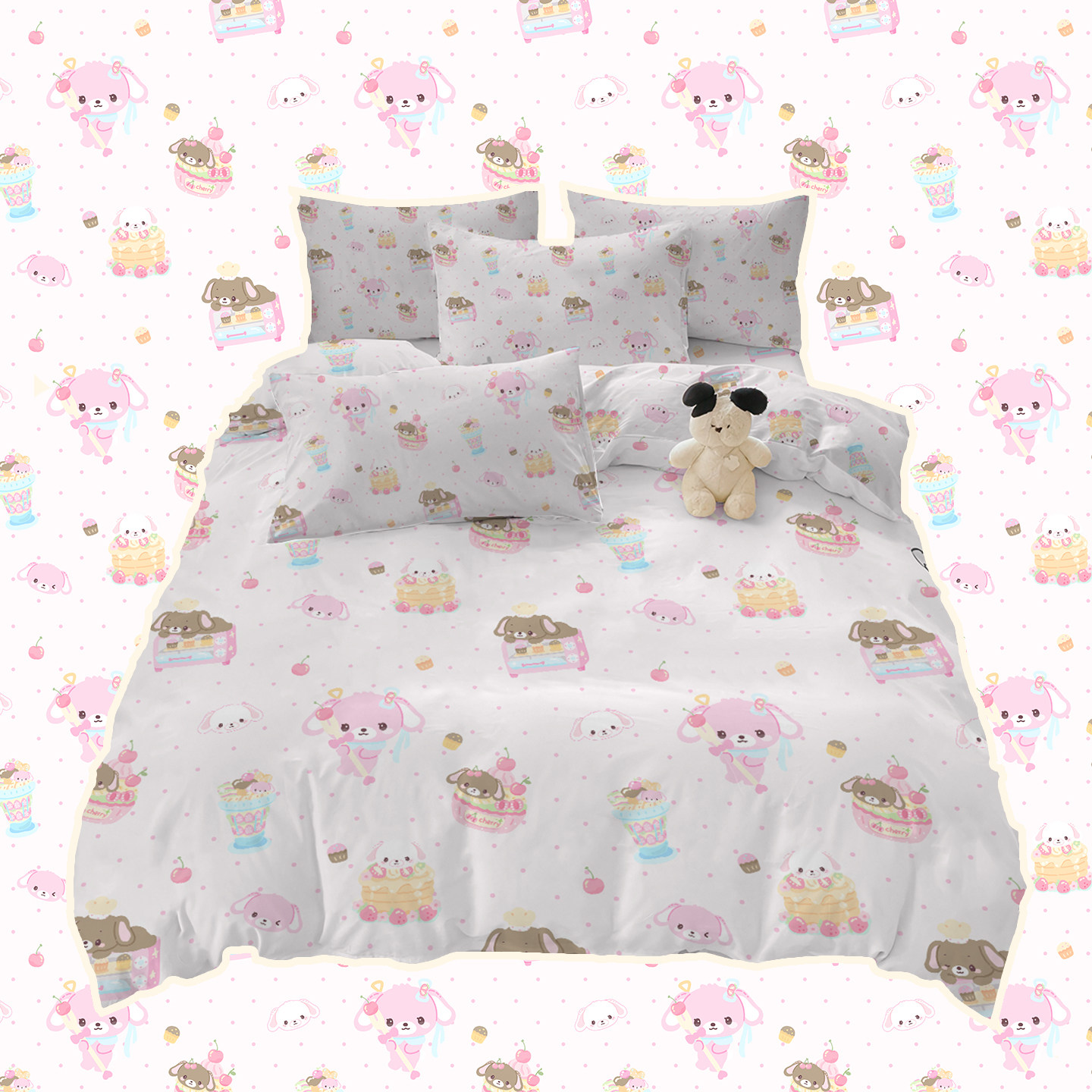 甜点兔锦棉四件套少女风三件套亲肤透气床品浅粉可爱床单被套卡通